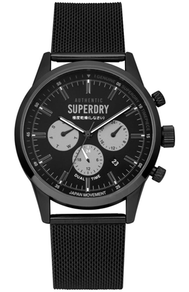 Ανδρικό ρολόι χειρός Superdry από μαύρο ανοξείδωτο ατσάλι με μαύρο καντράν και μπρασελέ.
