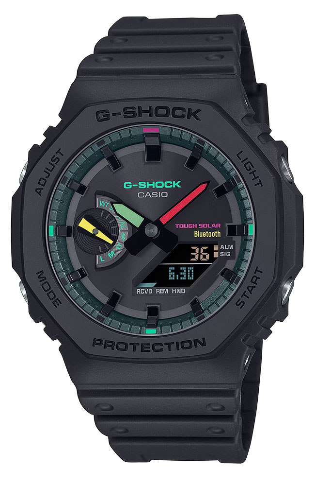 With Bluetooth® connectivity and a solar charging system, the new GA-B2100 shock-resistant watches take the iconic 2100 series to a whole other level. The Tough Solar charging system effectively converts light from any light source to power the watch, eliminating the need to replace the battery, and Smartphone pairing via Bluetooth® delivers accurate timekeeping. Combining the Carbon Core Guard structure, which protects the module and provides both shock resistance and a compact case, with G-SHOCK classic colours first used in the G-SHOCK 5600 models enables you to wear the latest, and the greatest G-SHOCK has to offer. GA-B2100-1AER has classic black styling with a white LCD.