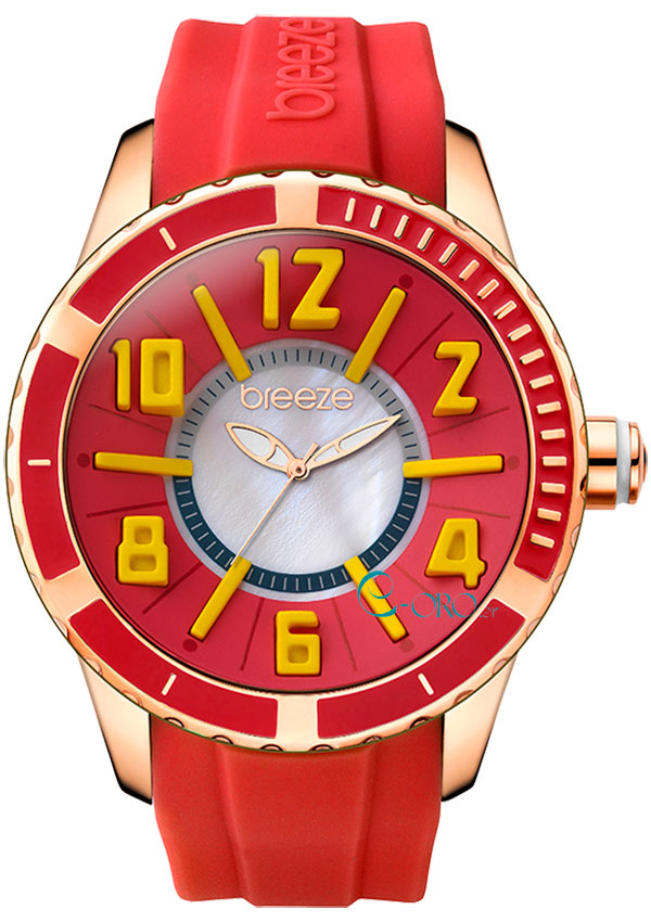 Γυναικείο ρολόι χειρός Breeze από ροζ επιχρυσωμένο ανοξείδωτο ατσάλι με φίλντισι καντράν και κόκκινο καουτσούκ λουράκι.