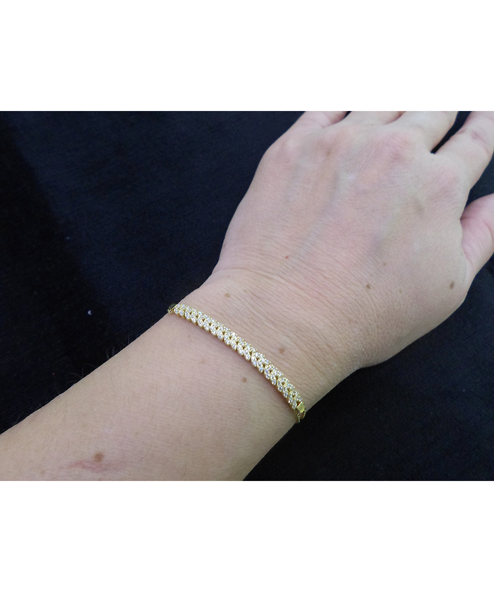 Εντυπωσιακό χρυσό βραχιόλι 14 καράτια διακοσμημένο με λαμπερά λευκά ζιργκόν. Κλασικό και κομψό κόσμημα που προσφέρει διαχρονική λάμψη και αποτελεί ιδανική επιλογή για βραδινές εμφανίσεις ή δώρο υψηλής αισθητικής.