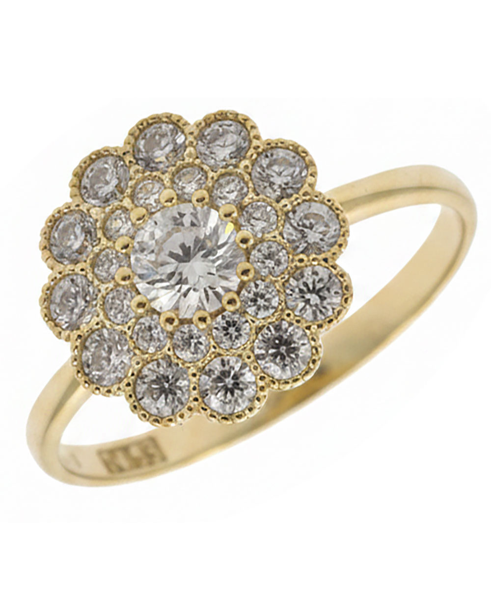Κομψό χρυσό δαχτυλίδι 9 καράτια με ροζέτα, κεντρική λευκή πέτρα και διπλό λαμπερό πλαίσιο από μικρότερες λευκές πέτρες. Το διαχρονικό του σχέδιο αποπνέει ρομαντισμό και κομψότητα, ιδανικό για καθημερινές elegant εμφανίσεις αλλά και για πιο ιδιαίτερες περιστάσεις. Ένα ξεχωριστό γυναικείο δαχτυλίδι με κλασική αισθητική και διακριτική πολυτέλεια.
