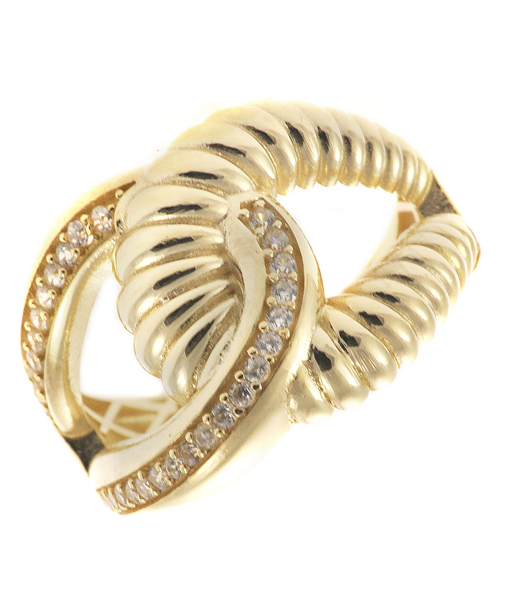 Κομψό χρυσό δαχτυλίδι 9 καράτια με ιδιαίτερο πλεκτό design, καμπύλες γραμμές και λευκές πέτρες που χαρίζουν διακριτική λάμψη. Ο μοναδικός του σχεδιασμός δημιουργεί ένα εντυπωσιακό αλλά ταυτόχρονα θηλυκό κόσμημα, ιδανικό για γυναίκες που αγαπούν τα fashion δαχτυλίδια με σύγχρονο ύφος. Φοριέται εύκολα μόνο του και αναδεικνύει κάθε εμφάνιση με ιδιαίτερο χαρακτήρα.
