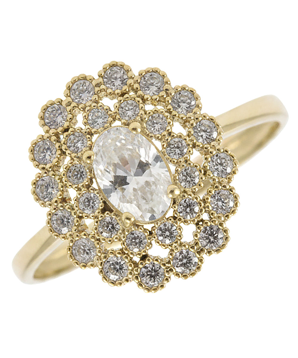 Εντυπωσιακό χρυσό δαχτυλίδι 9 καρατίων σε σχέδιο ροζέτας, με κεντρική οβάλ λευκή πέτρα και περίτεχνο πλαίσιο από μικρότερες λευκές πέτρες που χαρίζουν έντονη λάμψη. Ο ρομαντικός και διαχρονικός σχεδιασμός του το καθιστά ιδανικό για ιδιαίτερες εμφανίσεις, elegant σύνολα ή ως ξεχωριστό δώρο με θηλυκό χαρακτήρα. Ένα φίνο γυναικείο δαχτυλίδι που συνδυάζει κλασική κομψότητα και πολυτελή αισθητική.