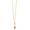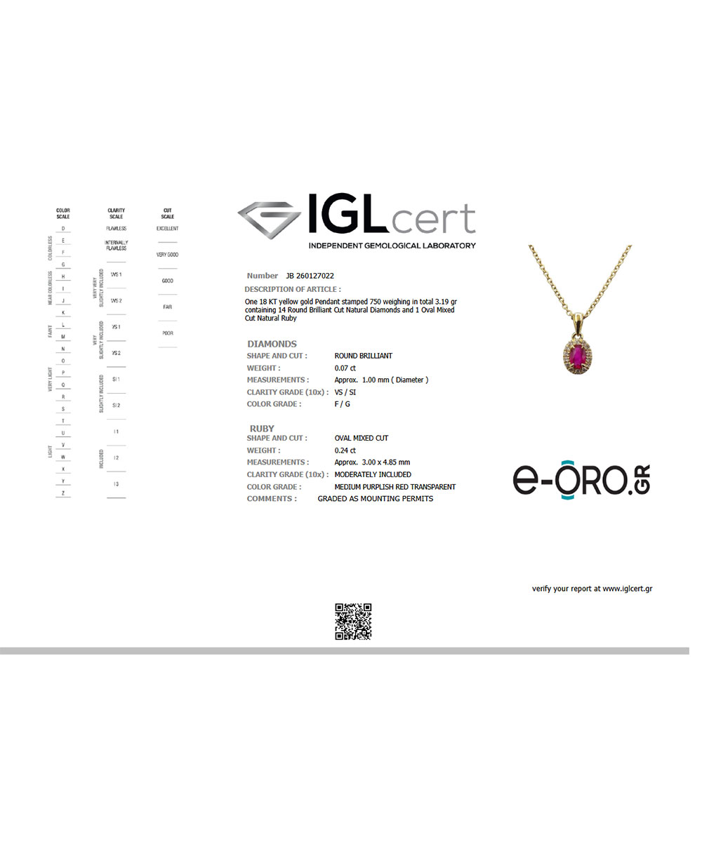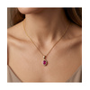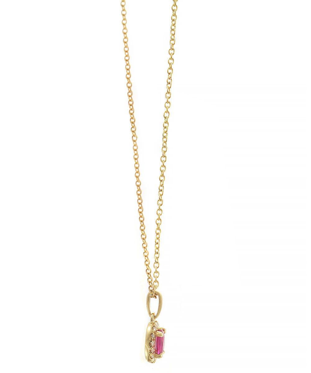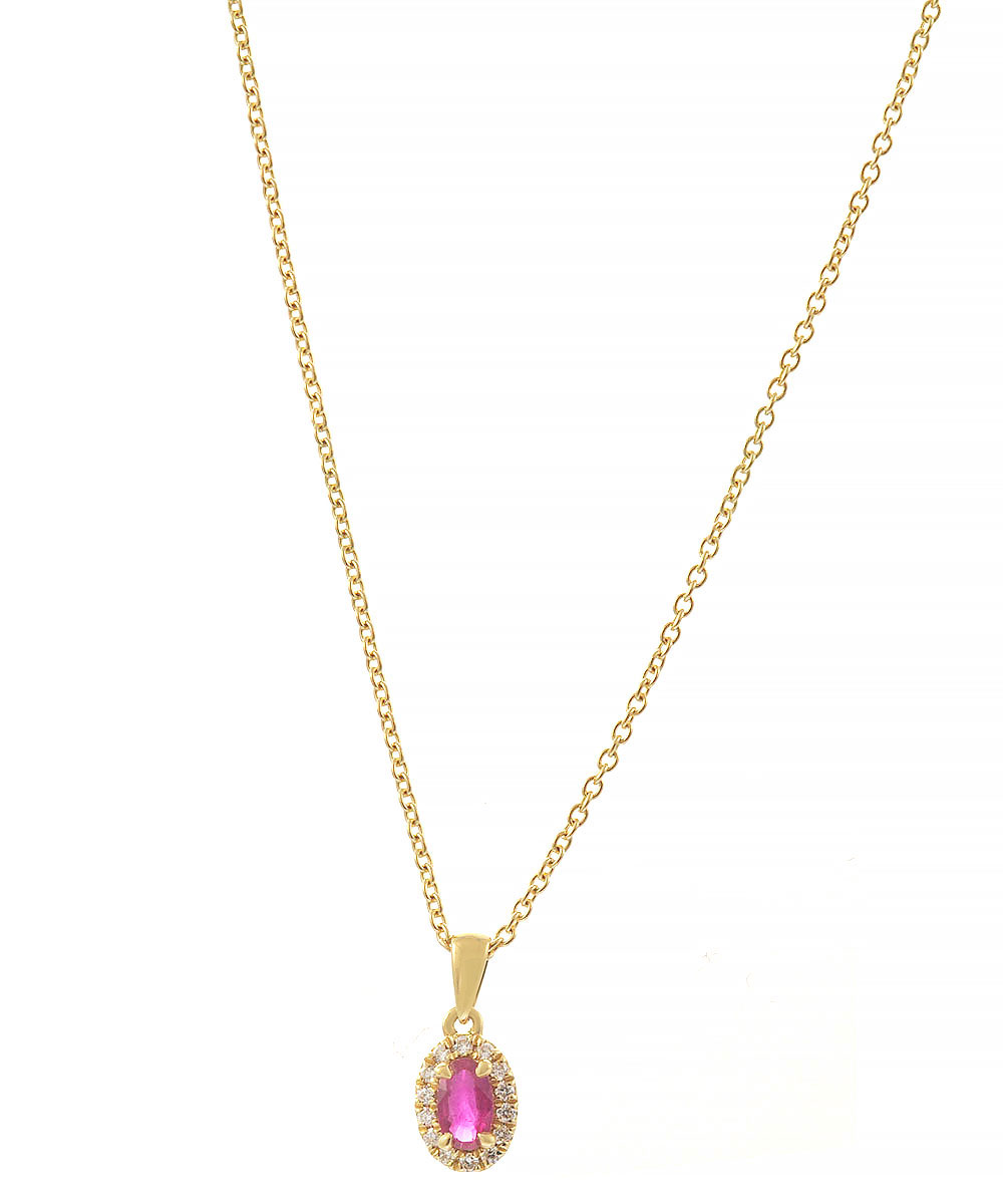 Κομψό κολιέ από χρυσό 18 καράτια με φυσικό ρουμπίνι σε οβάλ κοπή, πλαισιωμένο από λαμπερά διαμάντια. Ο halo σχεδιασμός ενισχύει τη λάμψη του κοσμήματος, ενώ το έντονο κόκκινο χρώμα του ρουμπινιού χαρίζει πάθος και πολυτέλεια.