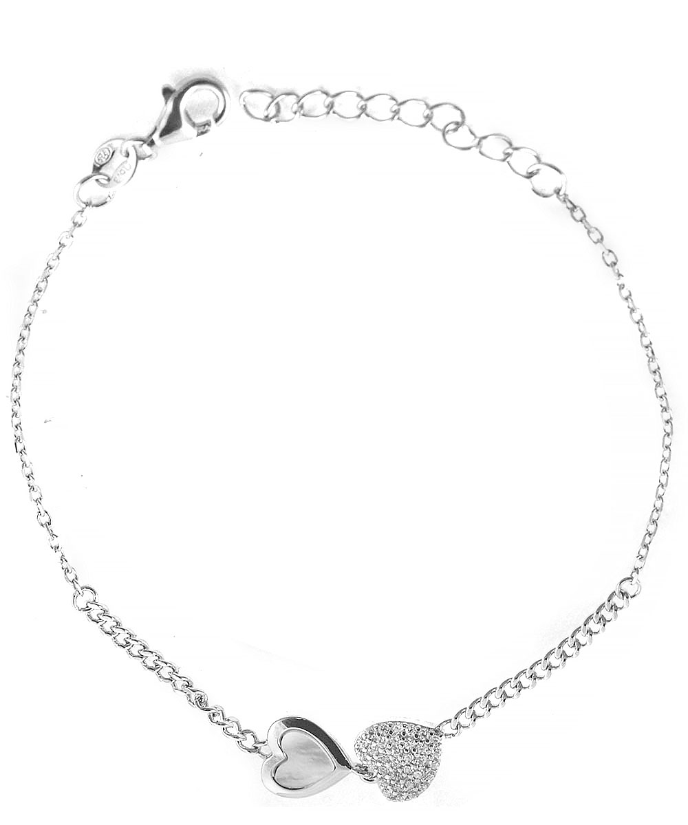 Ρομαντικό βραχιόλι από επιπλατινωμένο ασήμι 925° με δύο καρδιές, η μία διακοσμημένη με λαμπερά λευκά Ζιργκόν. Ένα γυναικείο κόσμημα γεμάτο αγάπη και λάμψη.