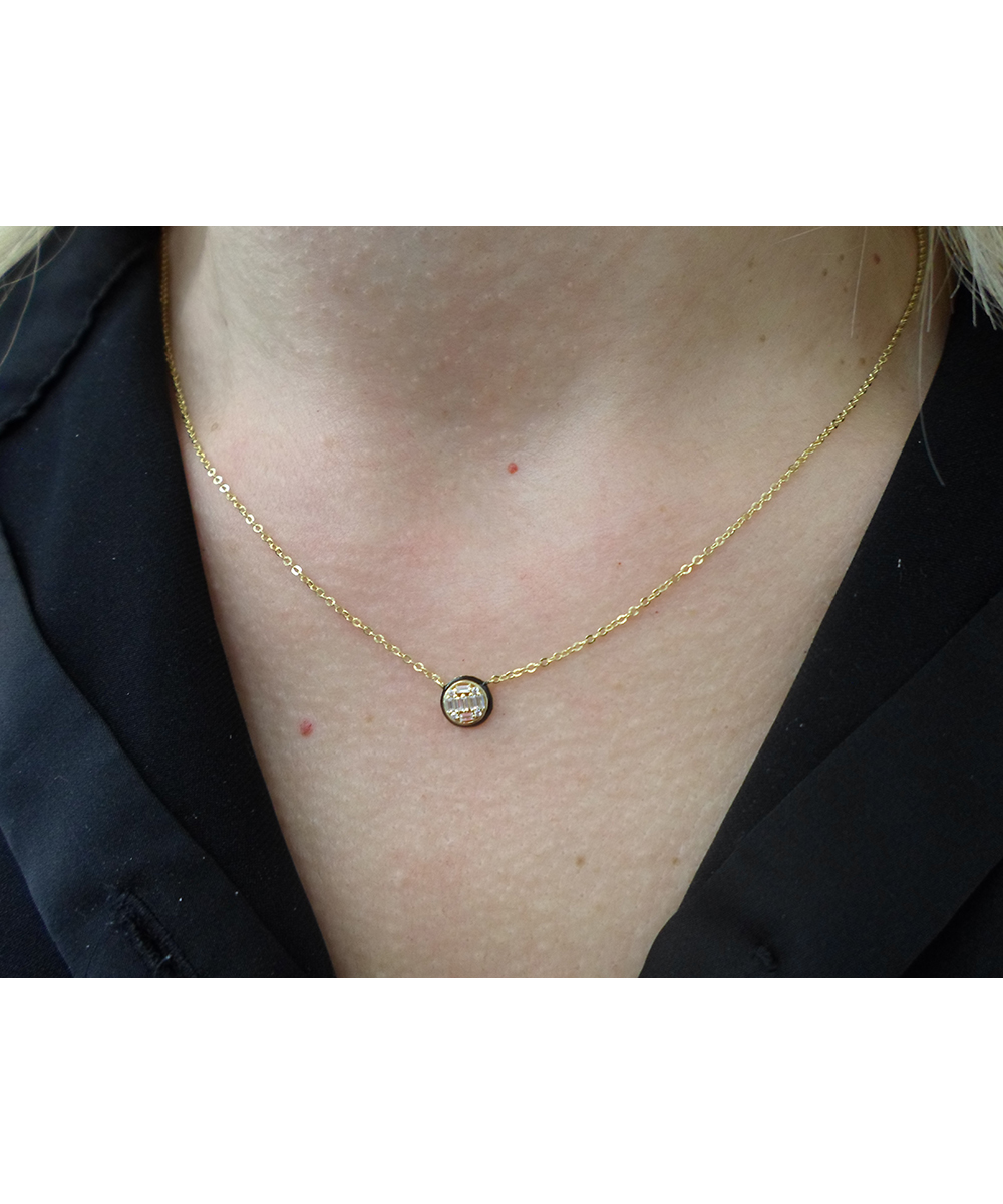 Μοντέρνο κολιέ από επιχρυσωμένο ασήμι 925 με στρογγυλό μενταγιόν σε μαύρο σμάλτο και baguette ζιργκόν. Διακριτικά πολυτελές, ιδανικό για elegant σύνολα και layering.