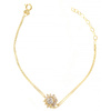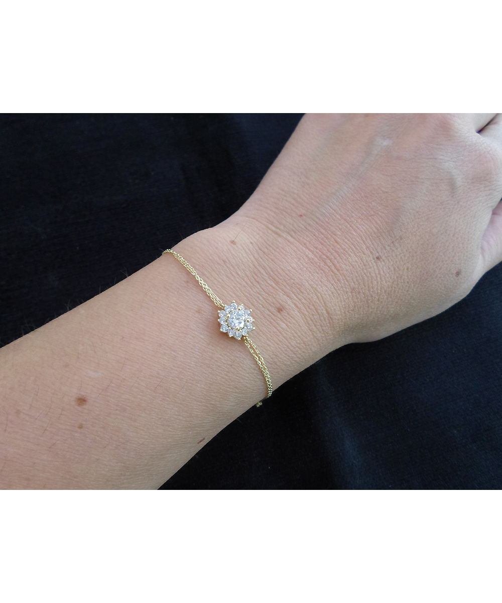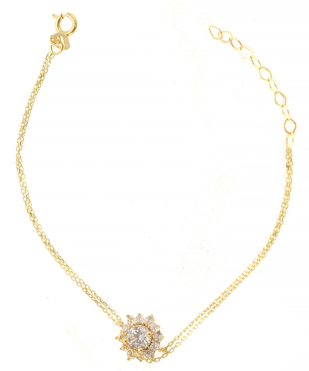 Χρυσό βραχιόλι 14 καράτια με διπλή αλυσίδα και κεντρικό μοτίφ λουλούδι διακοσμημένο με Ζιργκόν. Ρομαντικό κόσμημα για κάθε περίσταση.