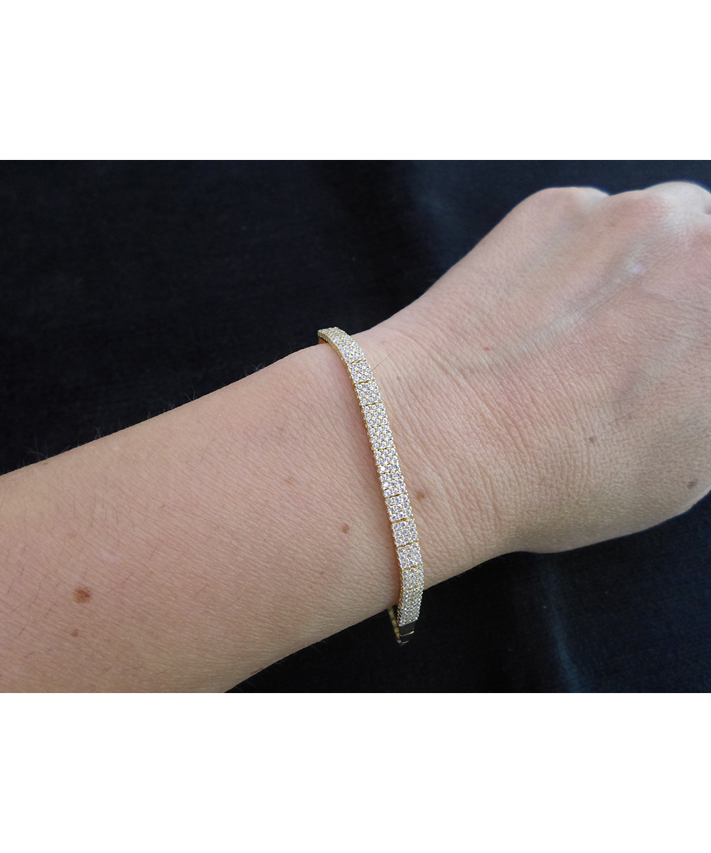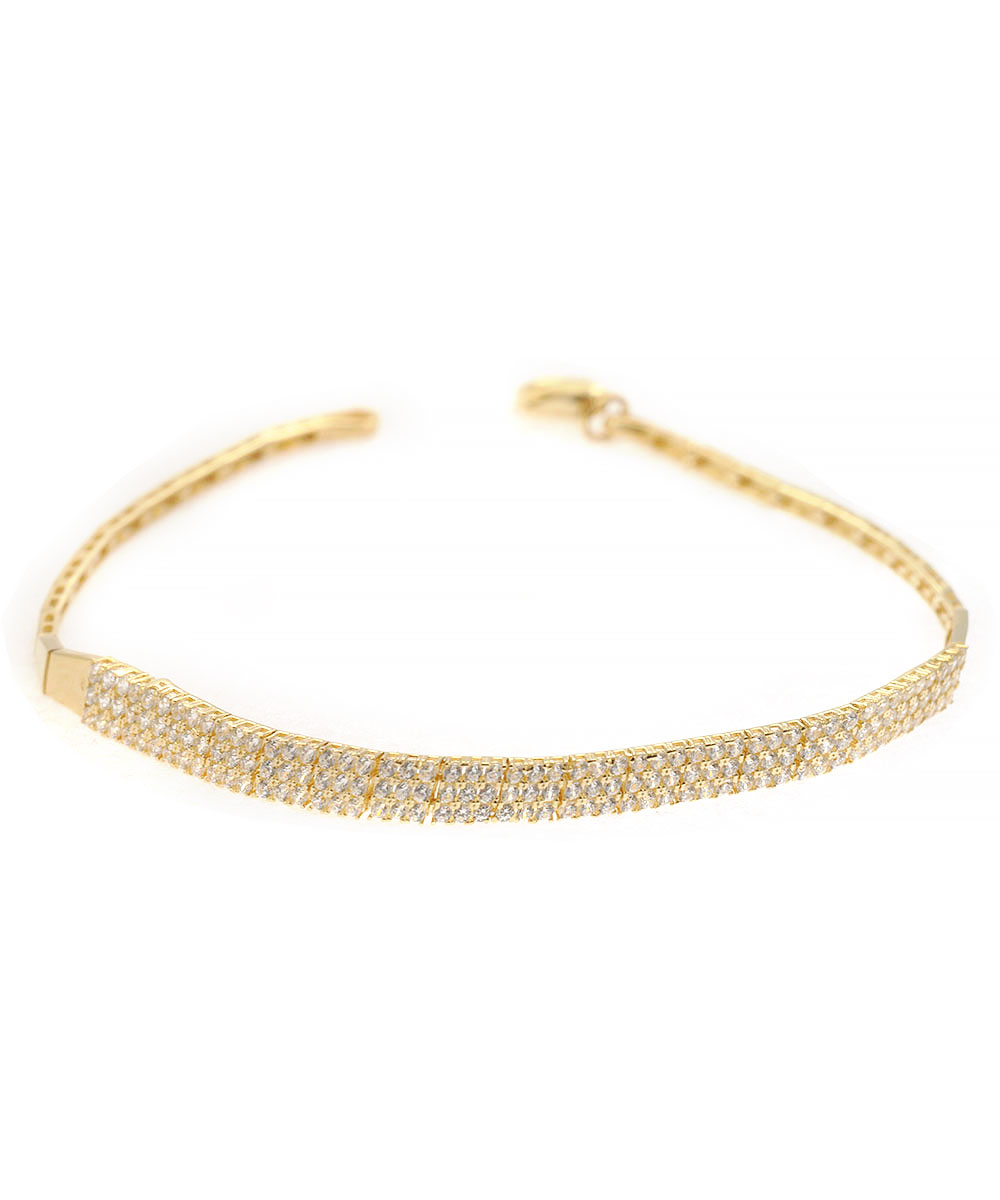Εντυπωσιακό βραχιόλι τύπου σειρέ από κίτρινο χρυσό 14 καράτια, στολισμένο με πολλές σειρές λευκών Ζιργκόν που χαρίζουν λάμψη. Πολυτελής επιλογή.