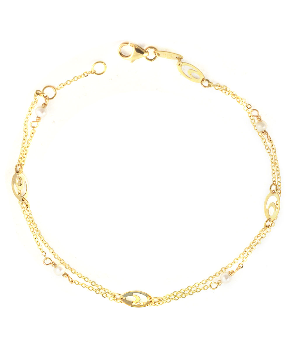 Εντυπωσιακό βραχιόλι διπλής αλυσίδας από χρυσό 9 καράτια με διακριτικά μοτίβα και μαργαριτάρια. Θηλυκό και κομψό κόσμημα που αναδεικνύει το στυλ σου με φινέτσα. Ιδανικό για δώρο ή καθημερινή κομψότητα.