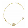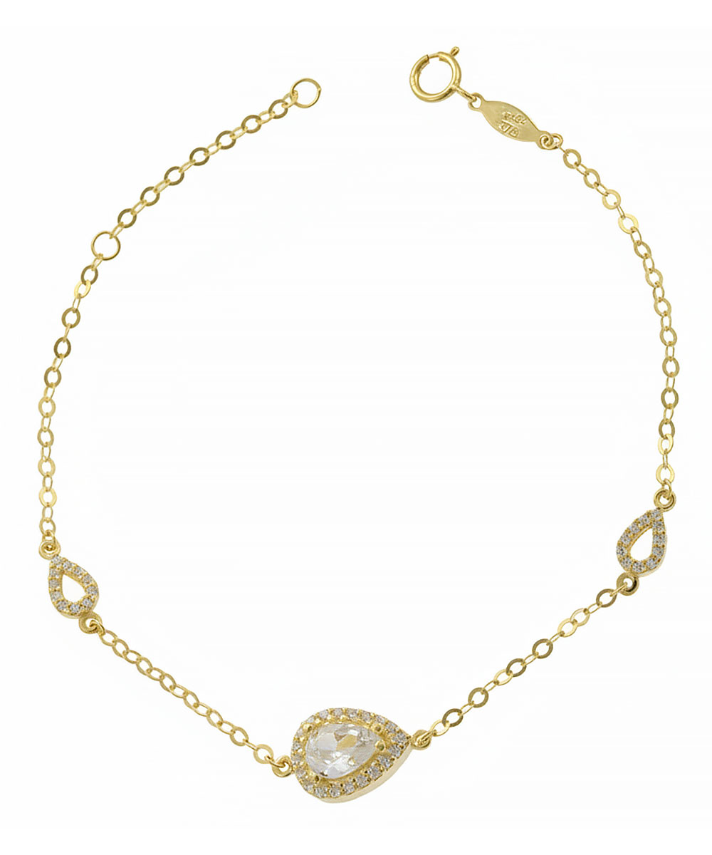 Εντυπωσιακό βραχιόλι από χρυσό 9 καράτια με κεντρικό μοτίφ σε σχήμα δάκρυ με λευκή πέτρα, πλαισιωμένη από λαμπερά ζιργκόν. Τα διακριτικά πλαϊνά στοιχεία προσθέτουν κομψότητα και λάμψη.