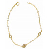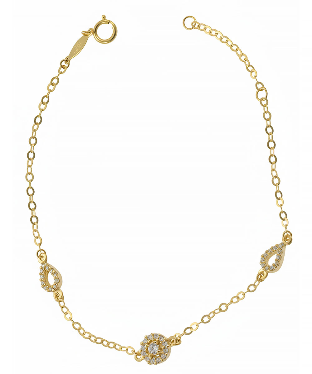 Λεπτεπίλεπτο βραχιόλι από χρυσό 9 καράτια με κεντρικό μοτίφ ροζέτας διακοσμημένο με λαμπερά λευκά ζιργκόν. Τα πλαϊνά στοιχεία σε σχήμα δάκρυ χαρίζουν επιπλέον κομψότητα και διακριτική λάμψη.