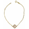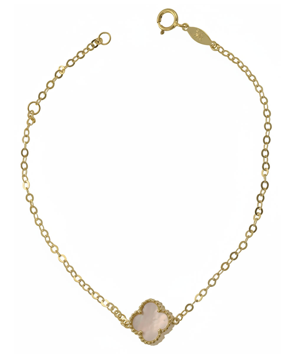 Λεπτό και κομψό βραχιόλι από χρυσό 9 καράτια με κεντρικό μοτίφ τετράφυλλο από λευκό φίλντισι, πλαισιωμένο από διακριτικό ανάγλυφο περίγραμμα. Ένα ρομαντικό κόσμημα που αποπνέει θηλυκότητα και διαχρονική κομψότητα.