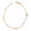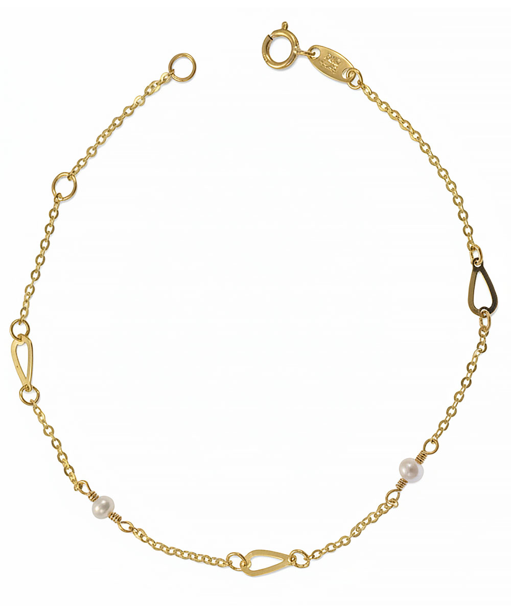 Κομψό βραχιόλι από χρυσό 9 καράτια με λεπτή αλυσίδα, διακοσμητικά μοτίφ σε σχήμα δάκρυ και δύο μικρά λευκά μαργαριτάρια. Ο συνδυασμός γεωμετρικού σχεδίου και φυσικής πέρλας δημιουργεί ένα εκλεπτυσμένο και μοντέρνο αποτέλεσμα.