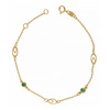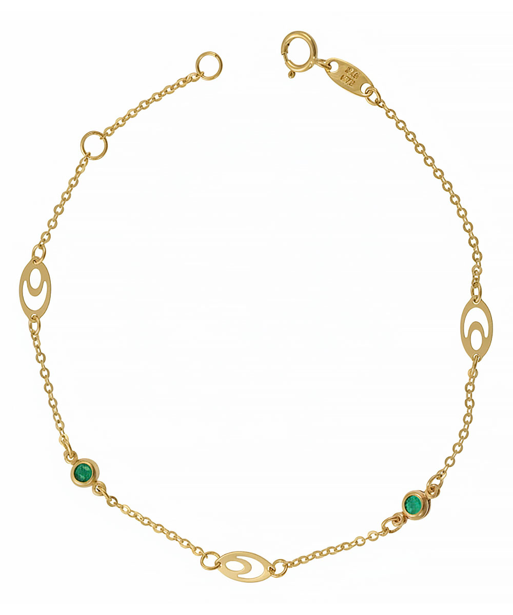 Minimal βραχιόλι από χρυσό 9 καράτια με λεπτή αλυσίδα και τρία ανοιχτά οβάλ μοτίφ που θυμίζουν “μάτι”, για ένα διακριτικό αλλά ξεχωριστό αποτέλεσμα. Δύο στρογγυλές πράσινες πέτρες σε στεφάνη προσθέτουν ένταση χρώματος και κάνουν το κόσμημα ιδανικό τόσο για καθημερινό layering όσο και για ένα κομψό δώρο.