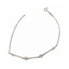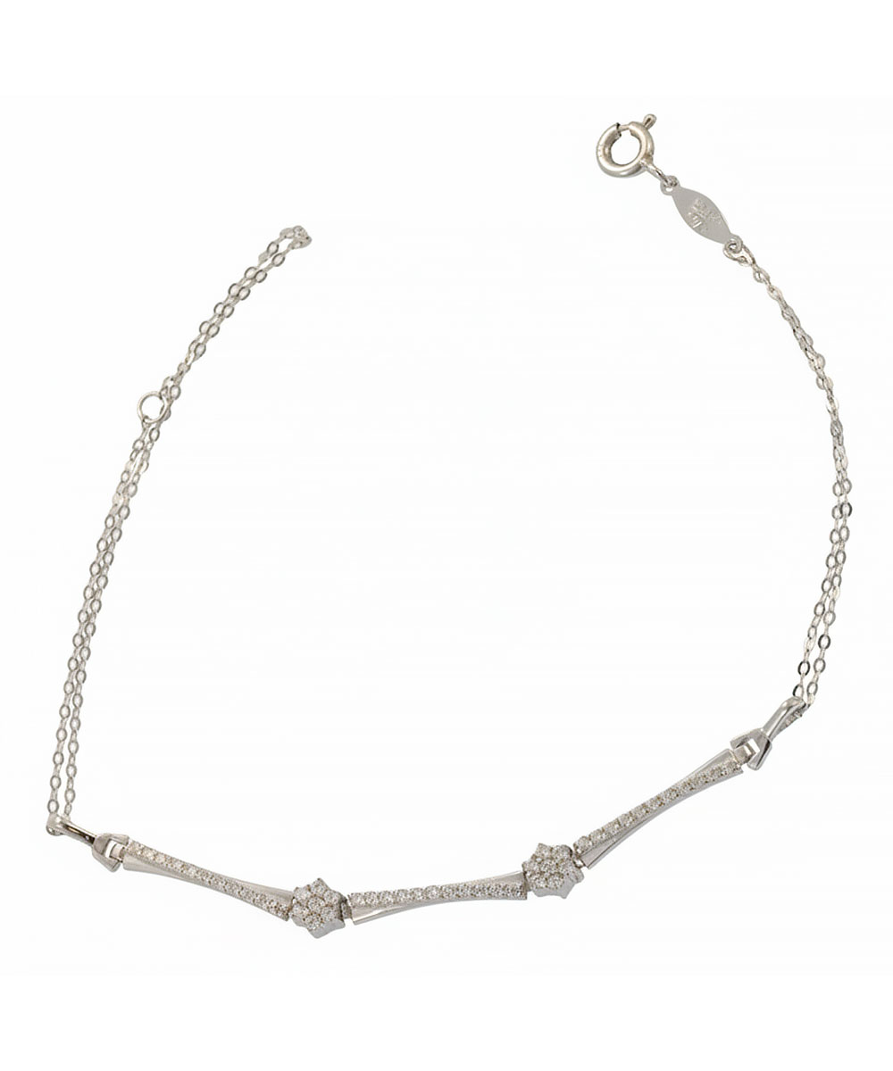 Κομψό βραχιόλι από λευκόχρυσο 9 καράτια με διπλή λεπτή αλυσίδα και κεντρικό διακοσμητικό στοιχείο τύπου μπάρας με ανάγλυφη, λαμπερή υφή. Δύο μικρά μοτίφ λουλούδι, στολισμένα με λευκές πέτρες, προσθέτουν διακριτική λάμψη και κάνουν το κόσμημα ιδανικό για καθημερινό chic αλλά και για πιο βραδινές εμφανίσεις.