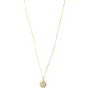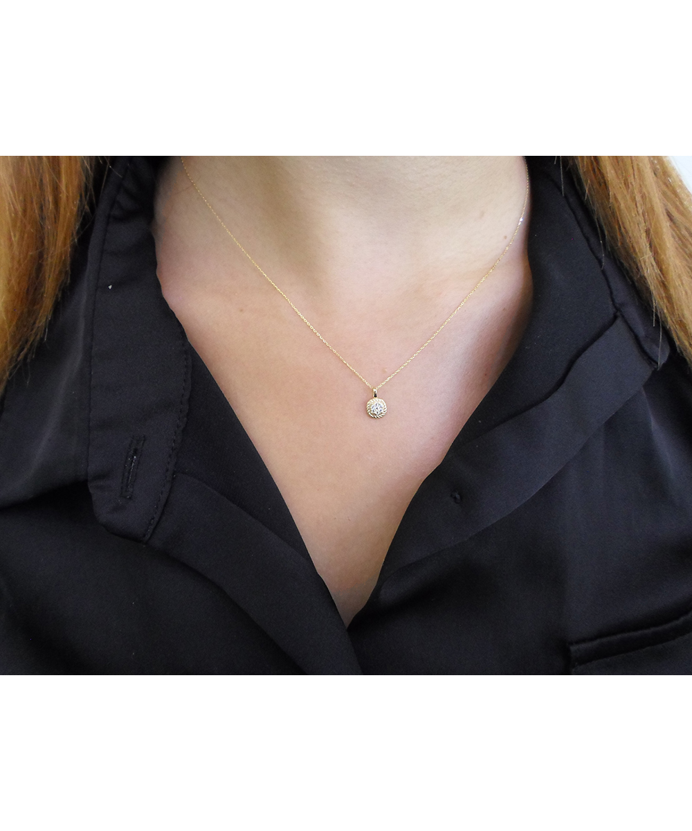 Κομψό κολιέ από χρυσό 14 καράτια με στρογγυλό κρεμαστό στολισμένο με λευκά Ζιργκόν. Λαμπερό κόσμημα για ξεχωριστές στιγμές.