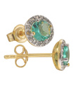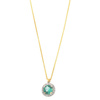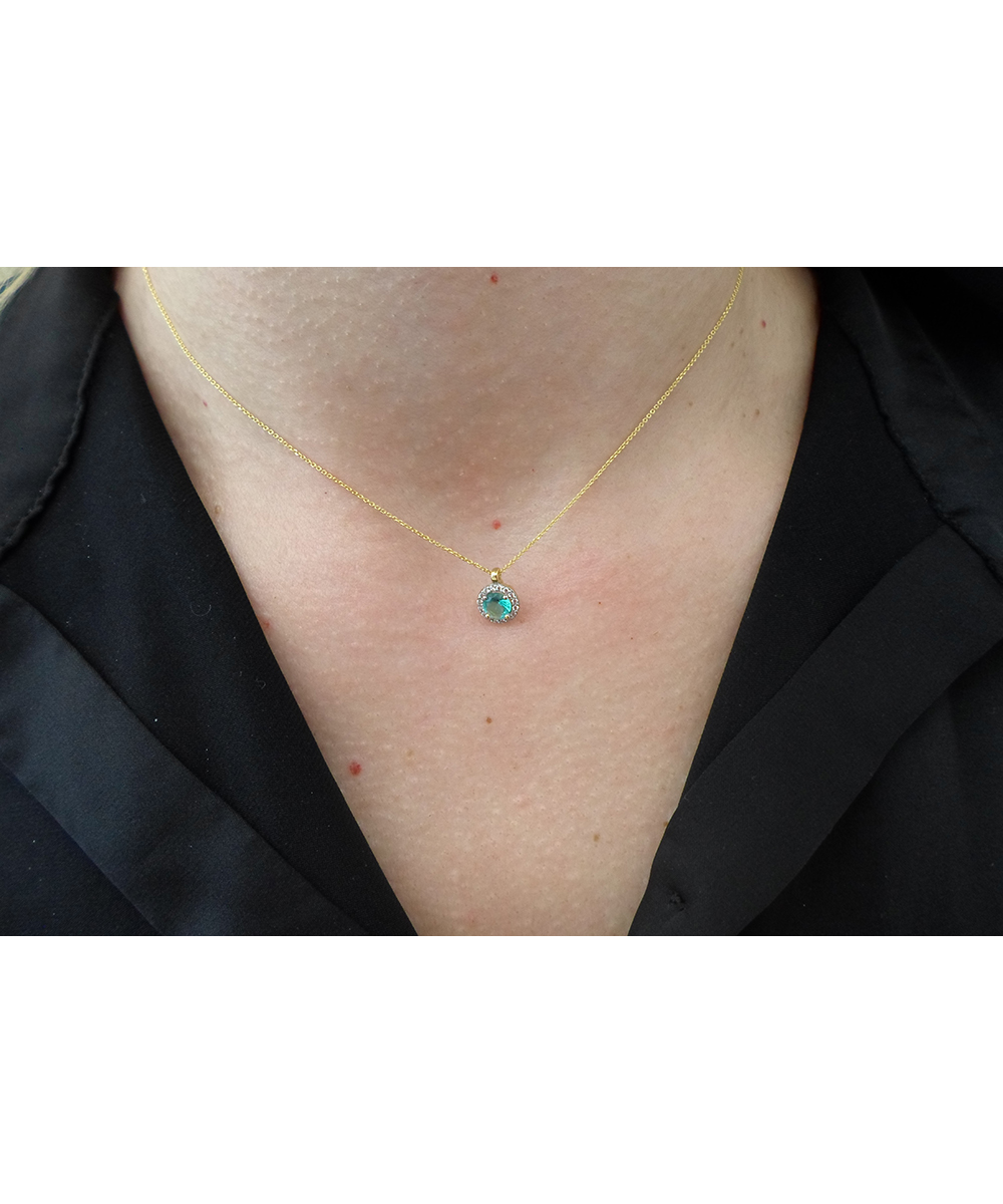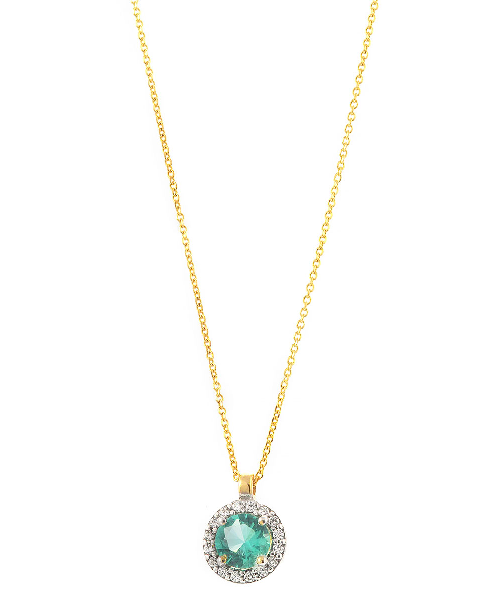Κολιέ από χρυσό 9Κ με εντυπωσιακή στρογγυλή πράσινη πέτρα και λαμπερό στεφάνι από λευκά ζιργκόν. Κρεμαστό halo design για εκλεπτυσμένο στυλ. Φόρεσέ το μόνο του ή συνδύασέ το με τα αντίστοιχα σκουλαρίκια για ολοκληρωμένο σετ.