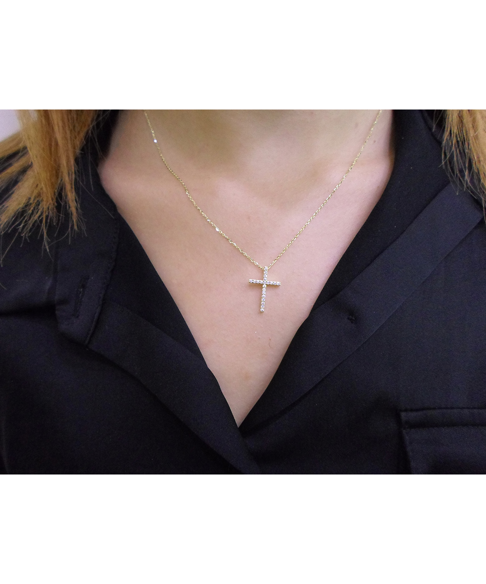 Εντυπωσιακός σταυρός με πυκνά τοποθετημένα ζιργκόν, σε κίτρινο χρυσό 9 καράτια. Συνοδεύεται από λεπτή αλυσίδα. Ένα διαχρονικό και λαμπερό κόσμημα.