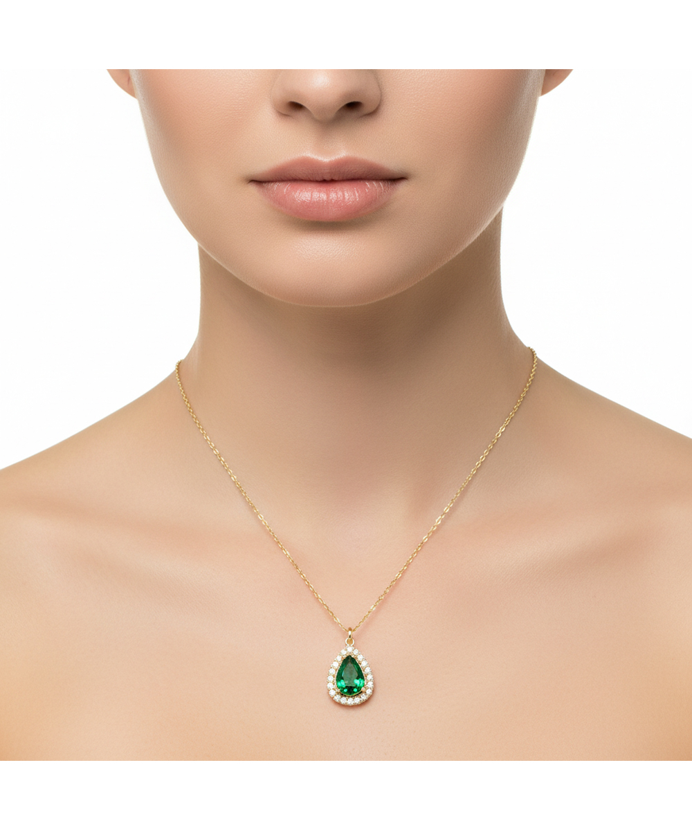 Εντυπωσιακό κολιέ ροζέτα από χρυσό 9 καράτια με σταγόνα πράσινης πέτρας περιμετρικά διακοσμημένης με ζιργκόν. Κομψό και φωτεινό κόσμημα για κάθε εμφάνιση.