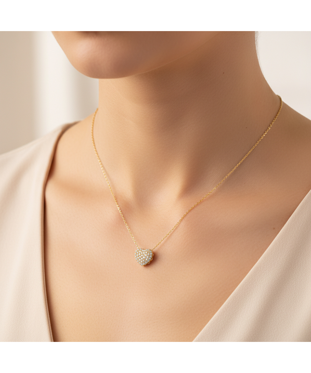 Ρομαντικό χρυσό κολιέ 9 καράτια σε σχήμα καρδιάς με λαμπερά ζιργκόν. Ένα κόσμημα που συμβολίζει την αγάπη και την τρυφερότητα, ιδανικό για δώρο σε ξεχωριστές στιγμές.