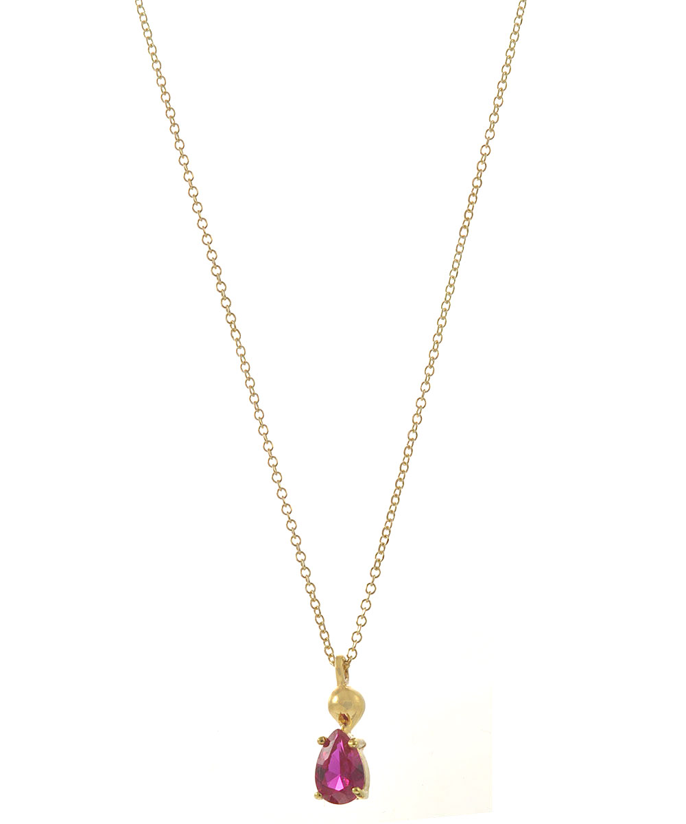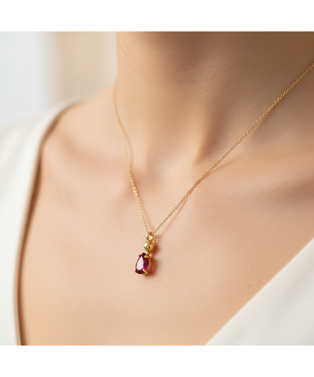 Λεπτό χρυσό κολιέ από χρυσό 9 καράτια, με κομψό μενταγιόν σε σχήμα δάκρυ και λαμπερή κόκκινη πέτρα. Το θηλυκό και elegant σχέδιο το καθιστά ιδανικό για καθημερινή χρήση αλλά και για πιο ιδιαίτερες εμφανίσεις. Ένα κόσμημα που προσθέτει διακριτική πολυτέλεια σε κάθε look.