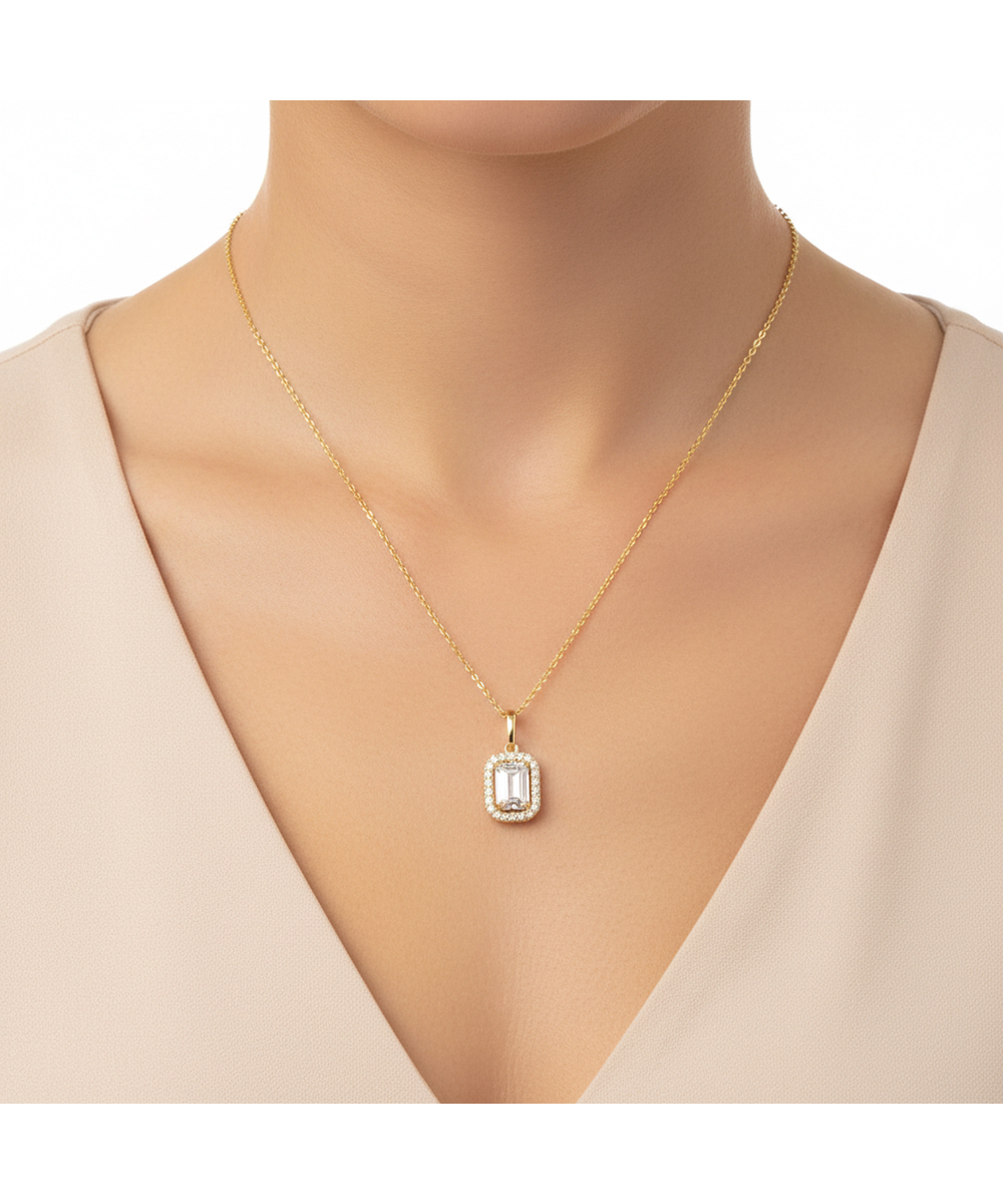 Εντυπωσιακό μενταγιόν από χρυσό Κ9 με κεντρικό ζιργκόν baguette και περιμετρικά μικρότερα. Κομψό design.