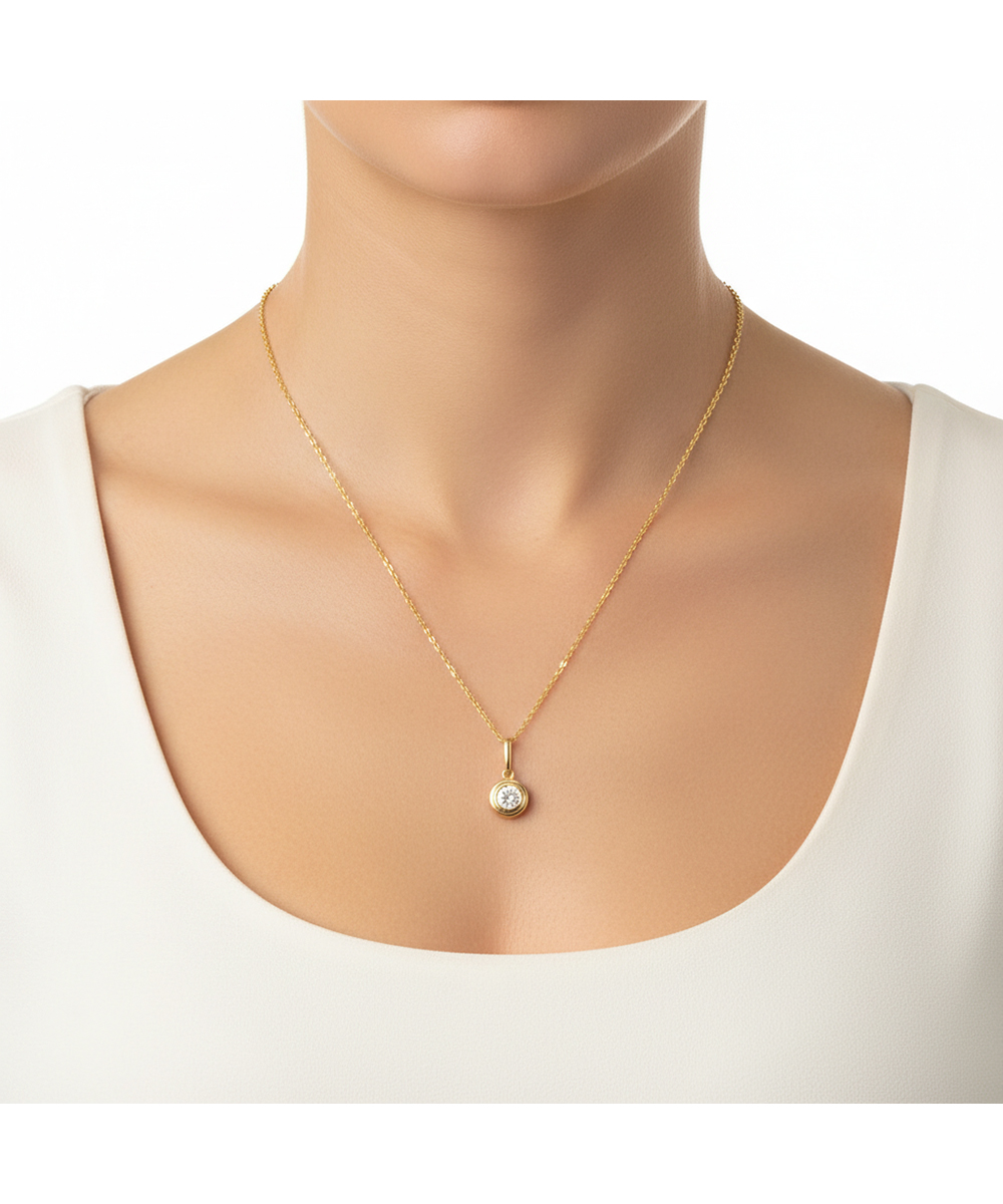 Αναδείξτε τη διαχρονική κομψότητα με αυτό το λεπτεπίλεπτο κολιέ από K9 χρυσό. Το σχέδιο διαθέτει μονό στρογγυλό ζιργκόν σε δέσιμο τύπου bezel, που προσφέρει διακριτική λάμψη και minimal αισθητική. Ιδανικό για καθημερινή χρήση ή layering με άλλα κολιέ.