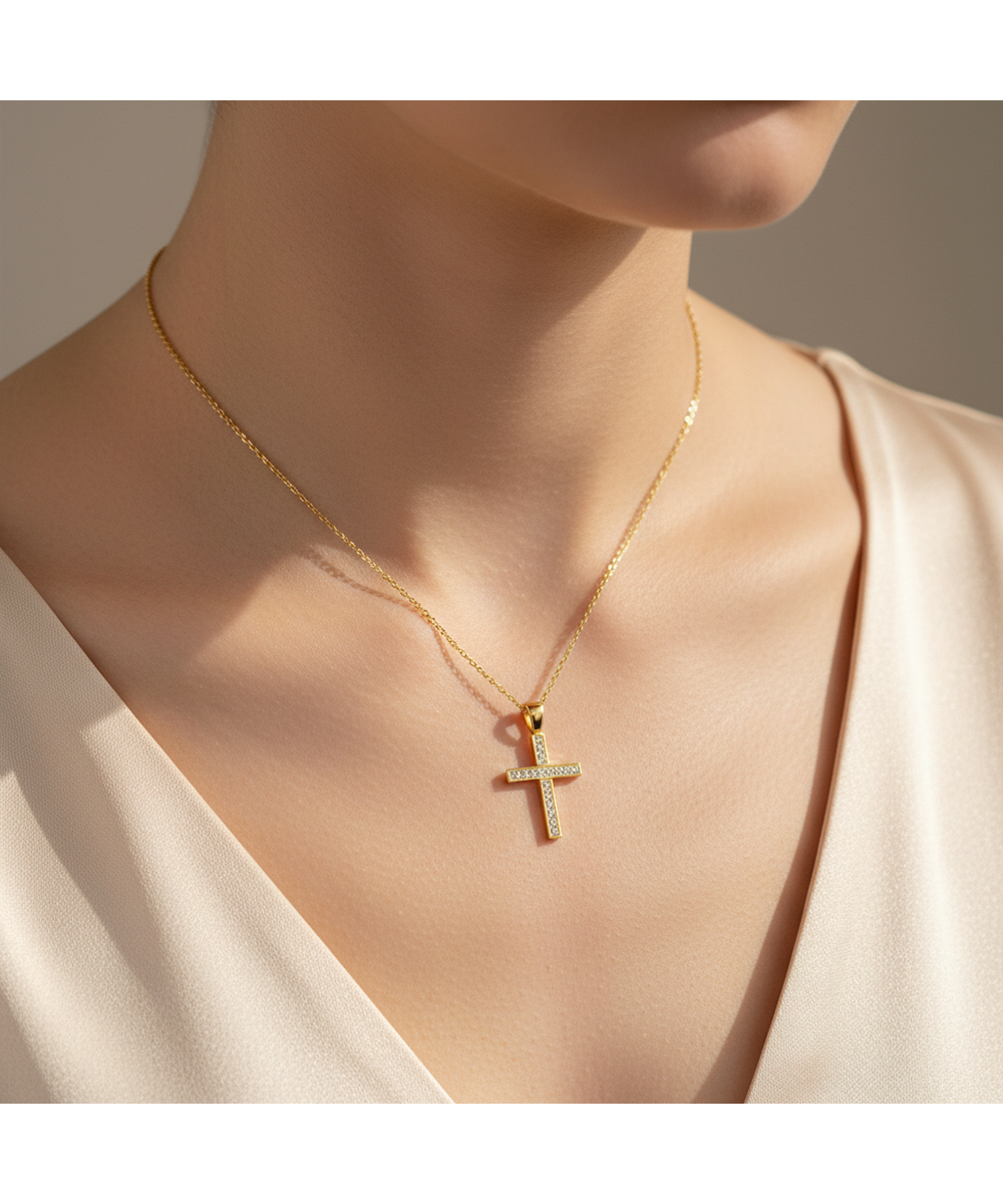 Γυναικείος σταυρός λευκόχρυσος 14 καράτια με πέτρες Ζιργκόν. Συνοδεύεται από αλυσίδα λευκόχρυση 14 καράτια.