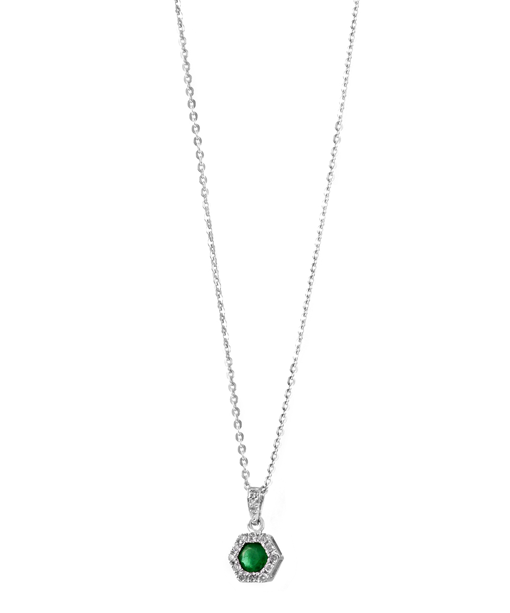 Γυναικείο Μενταγιόν Λευκόχρυσο 18 καράτια με Διαμάντια σε κοπή Μπριγιάν (Br) και Σμαράγδι. Συνοδεύεται από αλυσίδα Λευκόχρυση 14 καράτια.