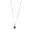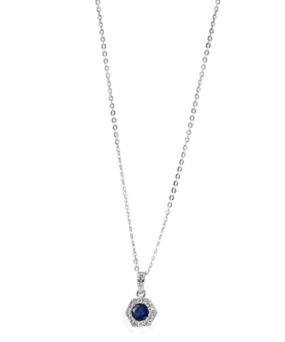 Γυναικείο Μενταγιόν Λευκόχρυσο 18 καράτια με Διαμάντια σε κοπή Μπριγιάν (Br) και Ζαφείρι. Συνοδεύεται από αλυσίδα Λευκόχρυση 14 καράτια.