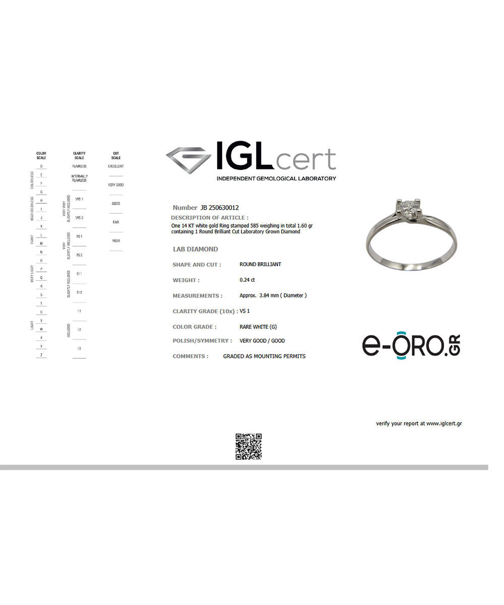 Μονόπετρο δαχτυλίδι λευκόχρυσο 14 καράτια με Lab Grown διαμάντι σε κοπή μπριγιάν(Br). Λιτή γραμμή, ιδανικό για προτάσεις ή στυλάτες εμφανίσεις.