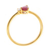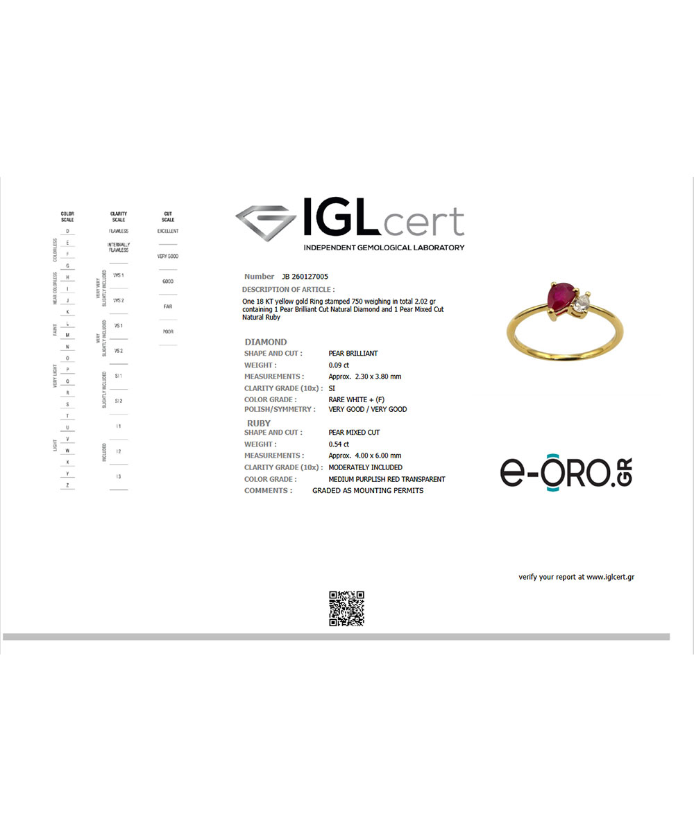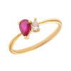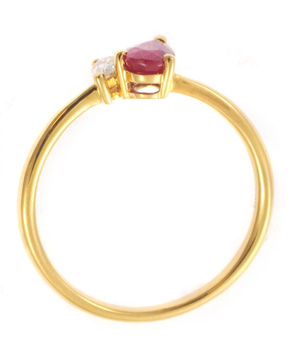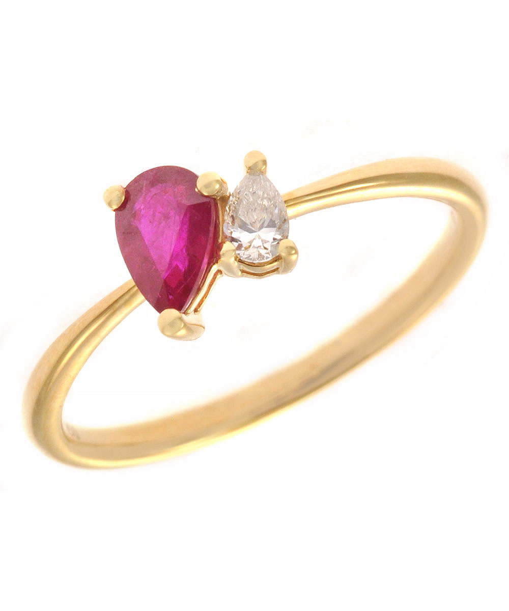 Μοναδικό δαχτυλίδι από χρυσό 18 καράτια με ρουμπίνι σε κοπή δάκρυ, το οποίο συνδυάζεται με λαμπερό διαμάντι στο πλάι. Ο ασύμμετρος σχεδιασμός δημιουργεί ένα μοντέρνο και ιδιαίτερο κόσμημα που ξεχωρίζει.