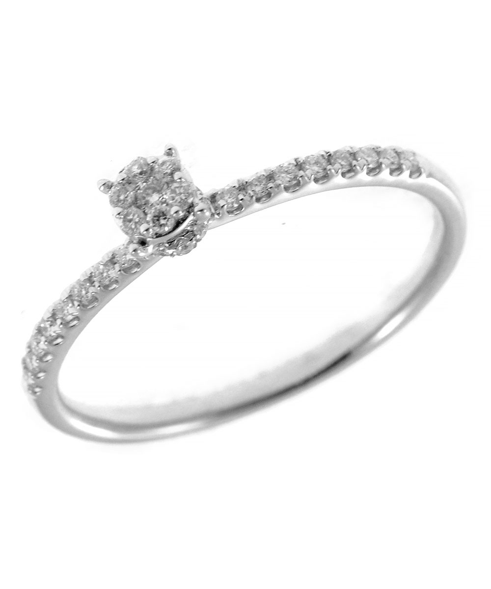 Διακριτικό δαχτυλίδι μονόπετρο από λευκόχρυσο 18 καράτια, στολισμένο με διαμάντια Brilliant. Ιδανικό για minimal chic εμφανίσεις ή ως μονόπετρο.