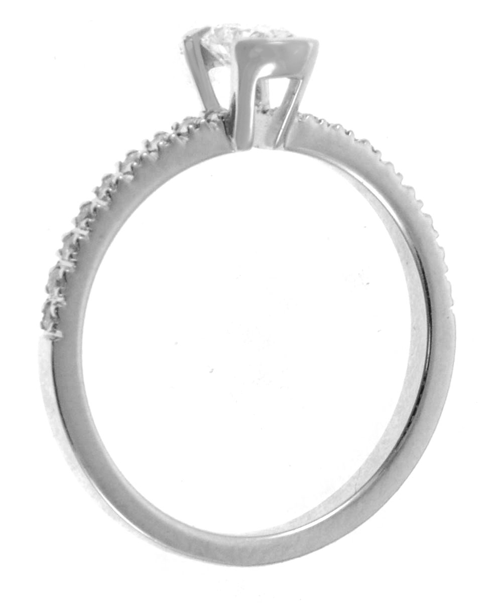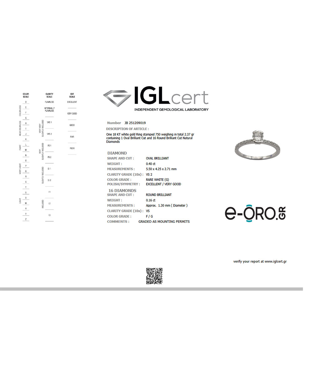 Εκλεπτυσμένο μονόπετρο δαχτυλίδι από λευκόχρυσο 18 καράτια, με κεντρικό φυσικό διαμάντι οβάλ. Η γάμπα είναι διακοσμημένη με λαμπερά διαμάντια brilliant, προσφέροντας εντυπωσιακή λάμψη και πολυτέλεια. Ένα κομψό και διαχρονικό κόσμημα, ιδανικό για πρόταση γάμου ή για μια ξεχωριστή στιγμή ζωής.