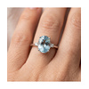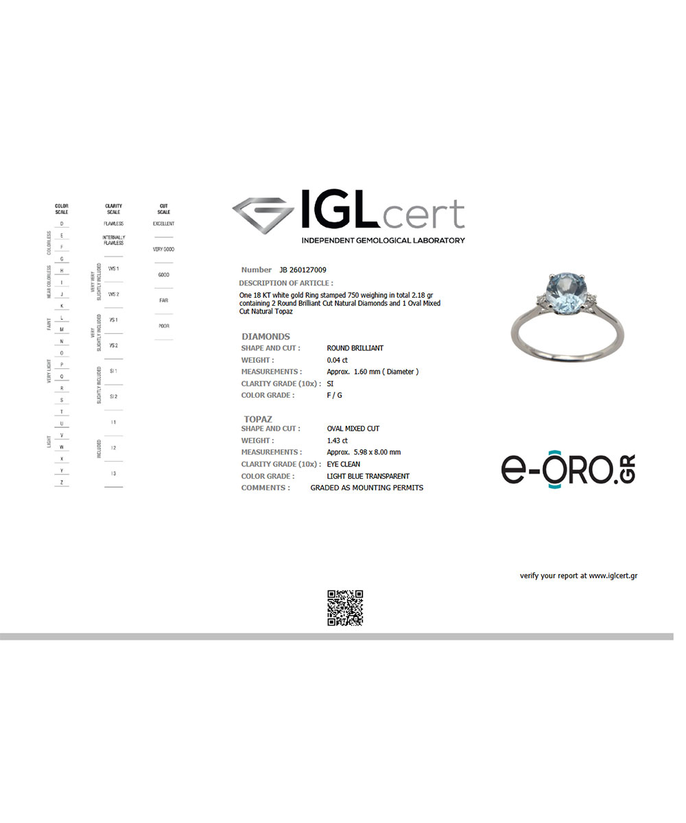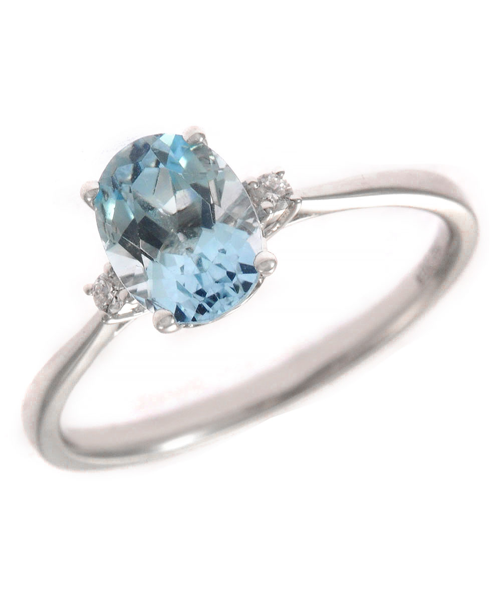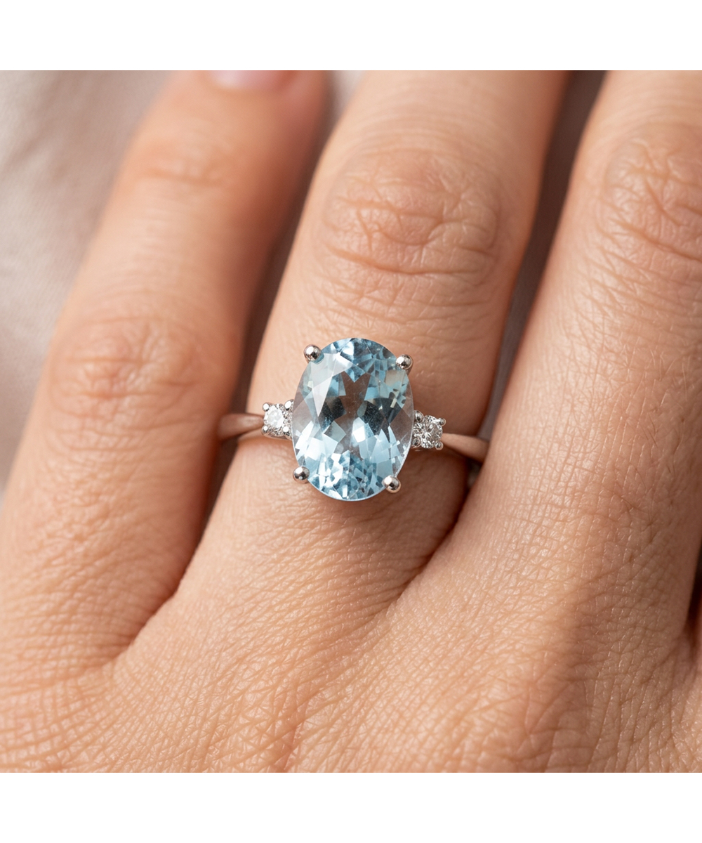 Κομψό δαχτυλίδι από λευκόχρυσο 18 καράτια με Sky Blue Topaz σε οβάλ κοπή, που χαρίζει φωτεινότητα και φρεσκάδα στο κόσμημα. Τα διακριτικά διαμάντια στα πλαϊνά ολοκληρώνουν το σχέδιο με μια elegant πινελιά λάμψης.