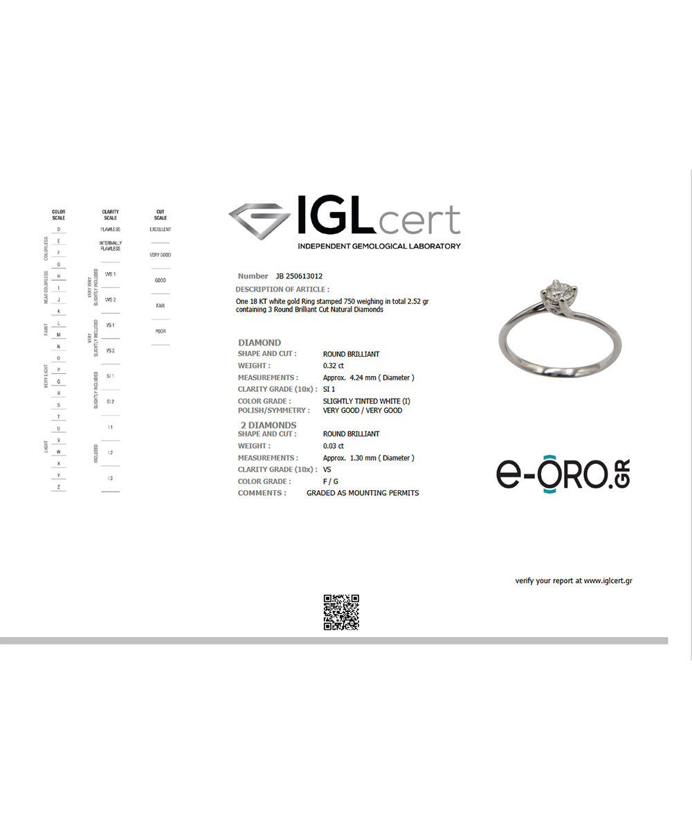 Μονόπετρο δαχτυλίδι από λευκόχρυσο 18 Καράτια με διαμάντια σε κοπή μπριγιάν(Br). Αρμονικός συνδυασμός λάμψης και λεπτομέρειας.