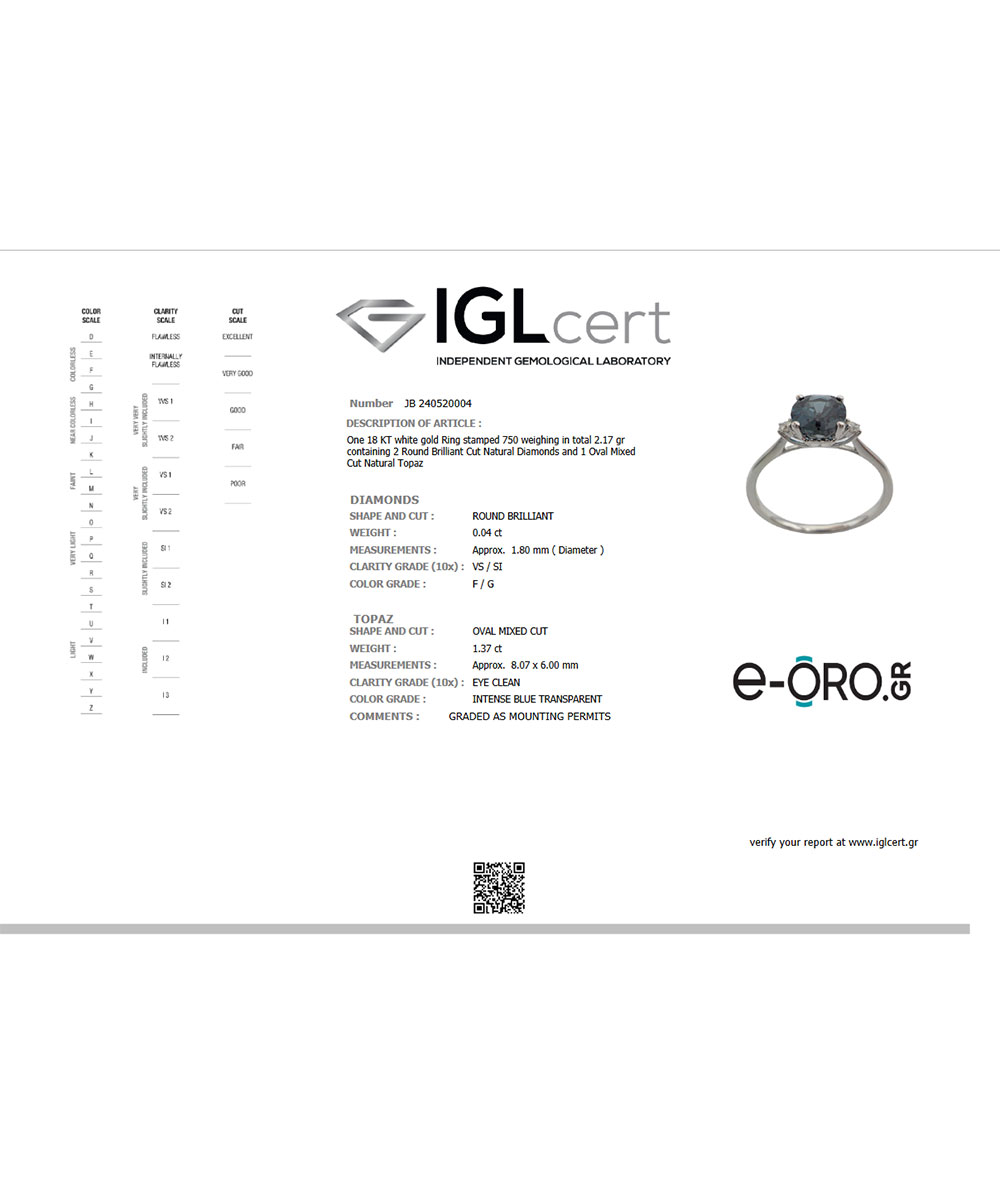 Γυναικείο μονόπετρο δαχτυλίδι από λευκόχρυσο 18 Καράτια με Διαμάντια σε κοπή Μπριγιάν(Br) και με πέτρα Τοπάζ.