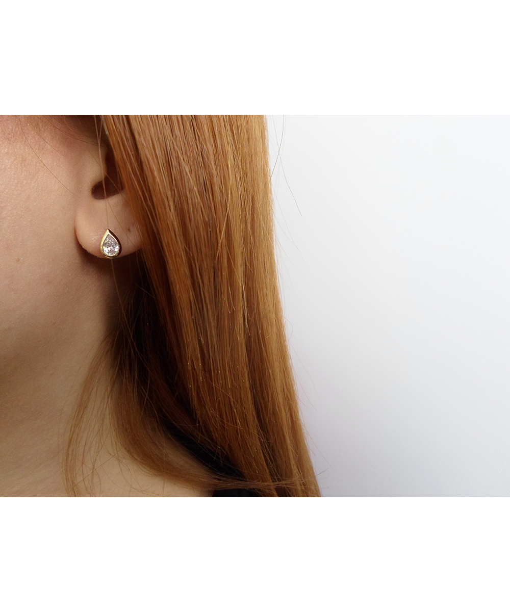Εκλεπτυσμένα σκουλαρίκια από χρυσό 14 καράτια σε σχήμα δάκρυ με λαμπερό λευκό Ζιργκόν. Μινιμαλιστικός σχεδιασμός που αναδεικνύει τη διαχρονική κομψότητα.