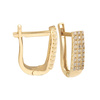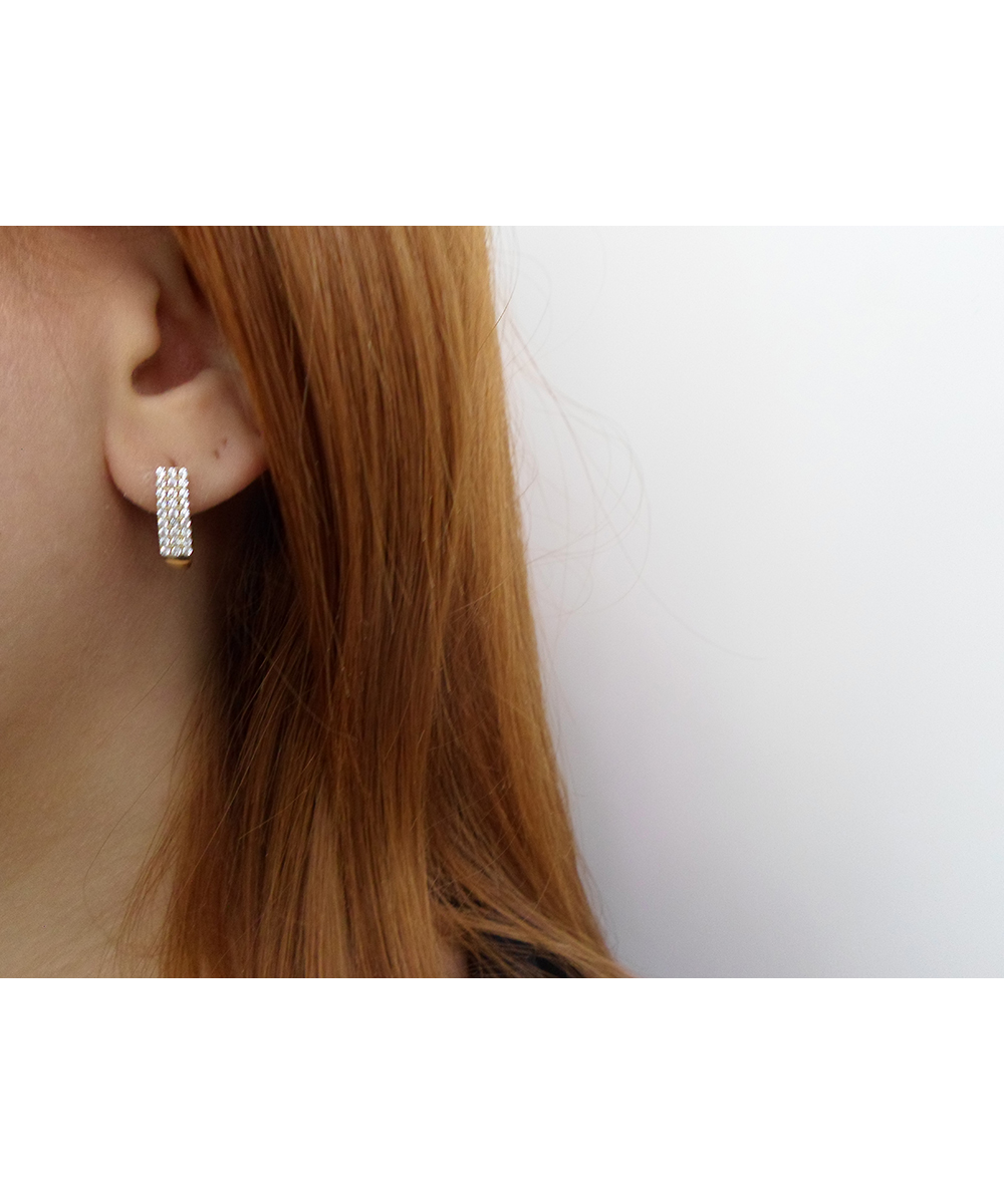 Μοντέρνα σκουλαρίκια σε σχήμα μικρού κρίκου από κίτρινο χρυσό 14 καράτια με τρεις σειρές λευκών Ζιργκόν. Λαμπερή πρόταση για το καθημερινό αλλά και το βραδινό σου look.