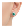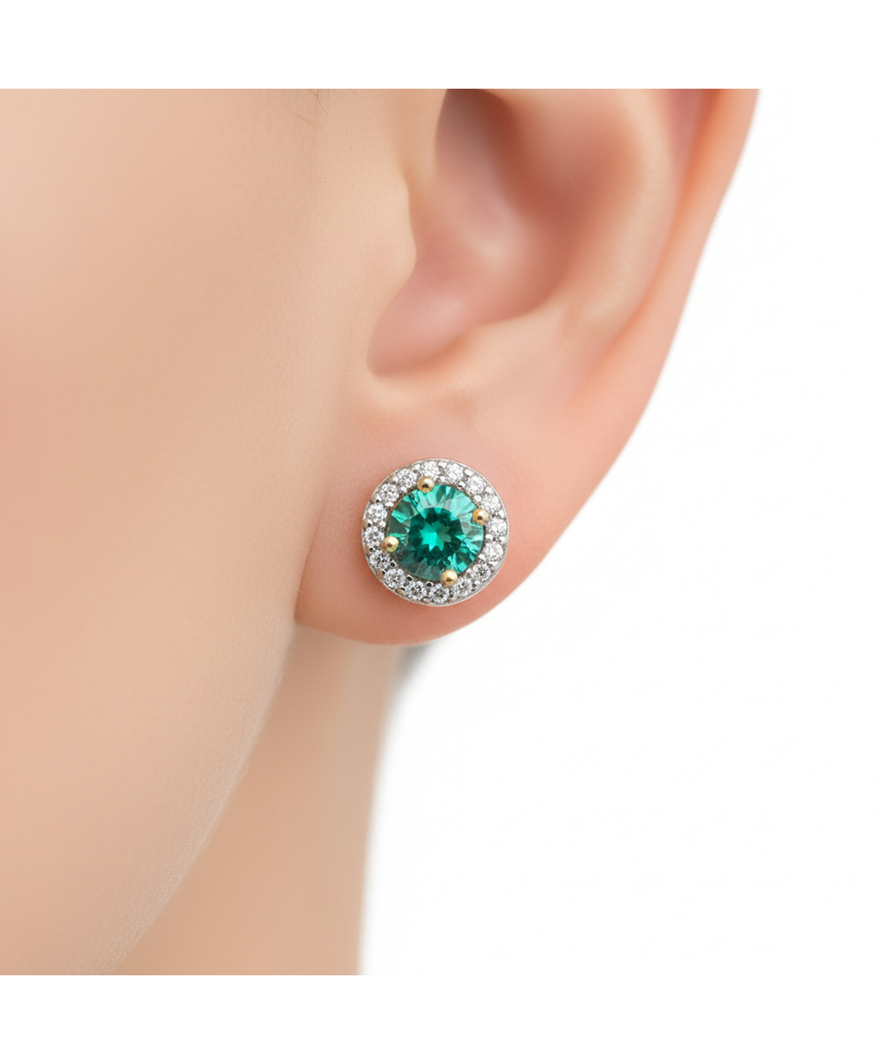 Γυναικεία σκουλαρίκια από χρυσό 9Κ με στρογγυλή πράσινη πέτρα και λαμπερό περίγραμμα από λευκά ζιργκόν. Ιδανικά για elegant εμφανίσεις, δώρο ή ολοκληρωμένο σετ με αντίστοιχο δαχτυλίδι. Σχέδιο που ξεχωρίζει με χρώμα και λάμψη.