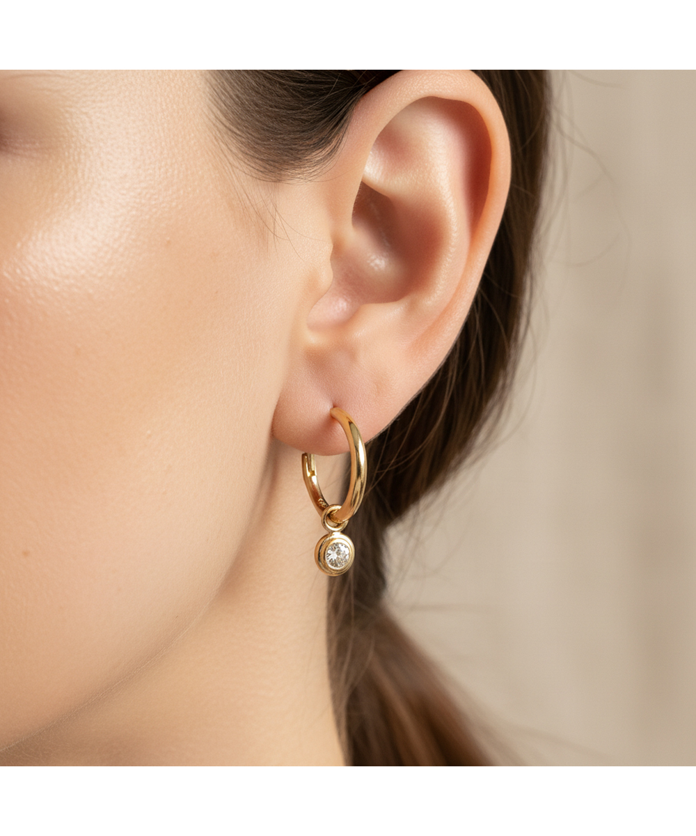 Χρυσά σκουλαρίκια κρίκοι από Κ9 με κρεμαστό λευκό ζιργκόν σε κυκλικό καστόνι. Κομψό και διαχρονικό design ιδανικό για καθημερινή χρήση ή layering.