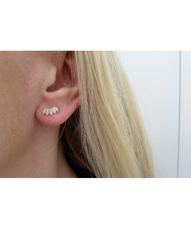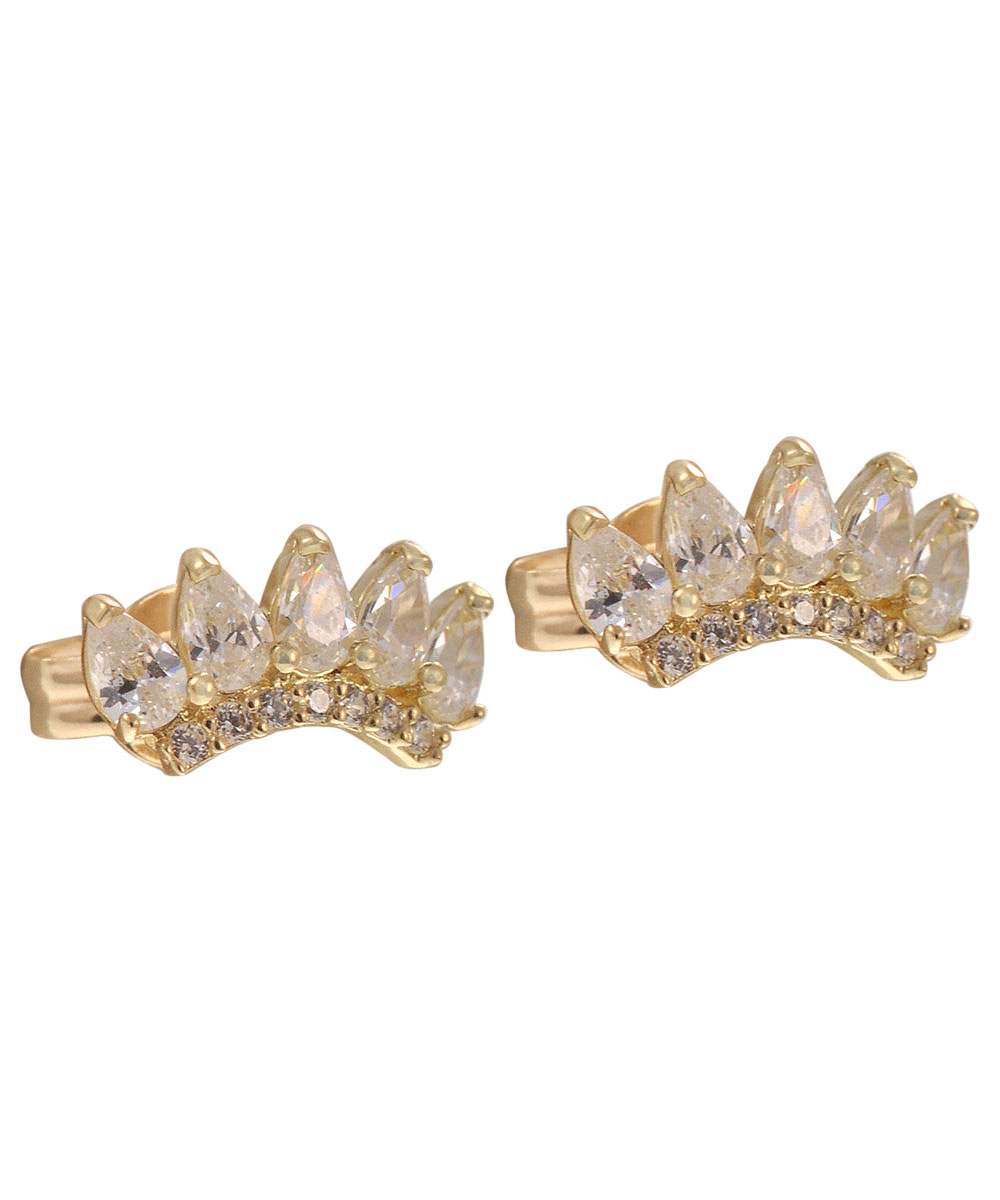 Καρφωτά σκουλαρίκια από χρυσό Κ9 με πέτρες ζιργκόν σε σχήμα δάκρυ και καμπύλο σχέδιο στεφανιού. Κομψή και λαμπερή επιλογή για βραδινές εμφανίσεις.