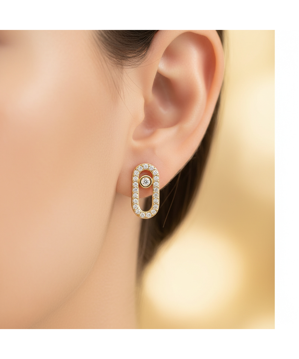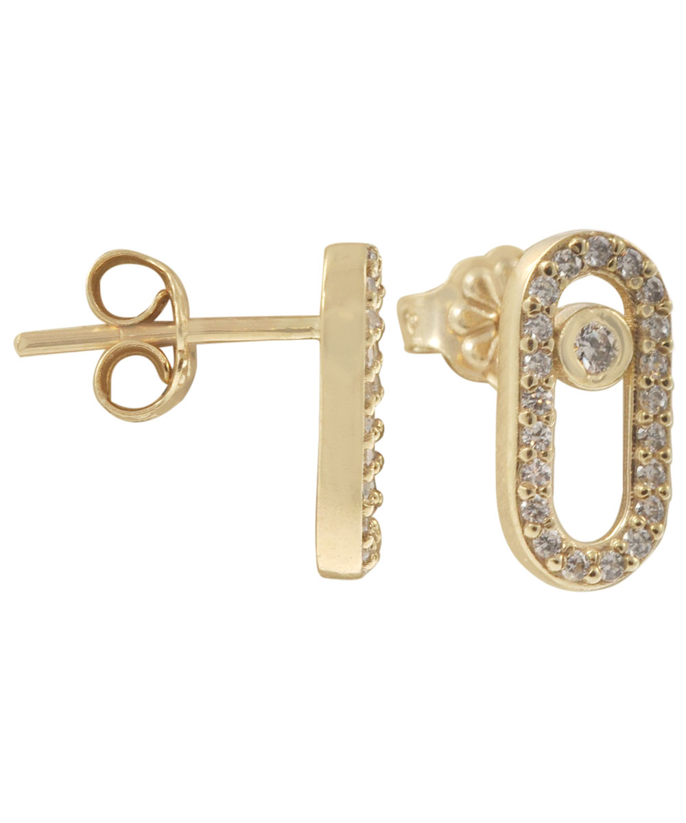 Κομψά χρυσά σκουλαρίκια 9 καράτια σε οβάλ σχέδιο, διακοσμημένα με λαμπερά λευκά ζιργκόν περιμετρικά. Minimal και διαχρονικά, ιδανικά για καθημερινή χρήση αλλά και για elegant εμφανίσεις. Ελαφριά και άνετα, προσθέτουν διακριτική λάμψη σε κάθε look και αποτελούν ιδανική επιλογή για δώρο.