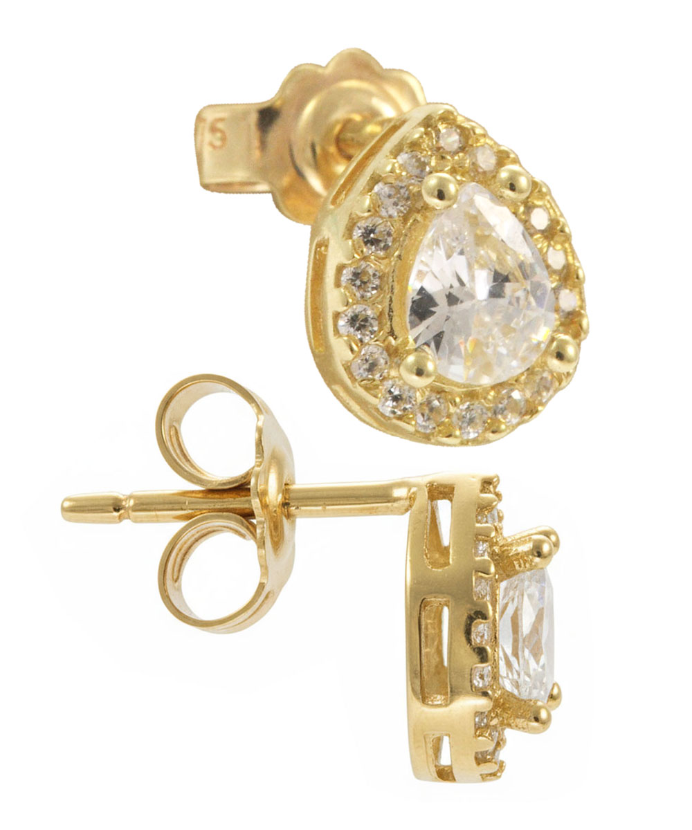 Κομψά χρυσά σκουλαρίκια 9 καράτια με λαμπερή λευκή πέτρα σε σχήμα δάκρυ, πλαισιωμένη από ζιργκόν που χαρίζουν εκθαμβωτική λάμψη. Ιδανική επιλογή για elegant εμφανίσεις, γάμους, βαπτίσεις ή ξεχωριστά δώρα. Ένα διαχρονικό κόσμημα που συνδυάζει φινέτσα και πολυτέλεια.