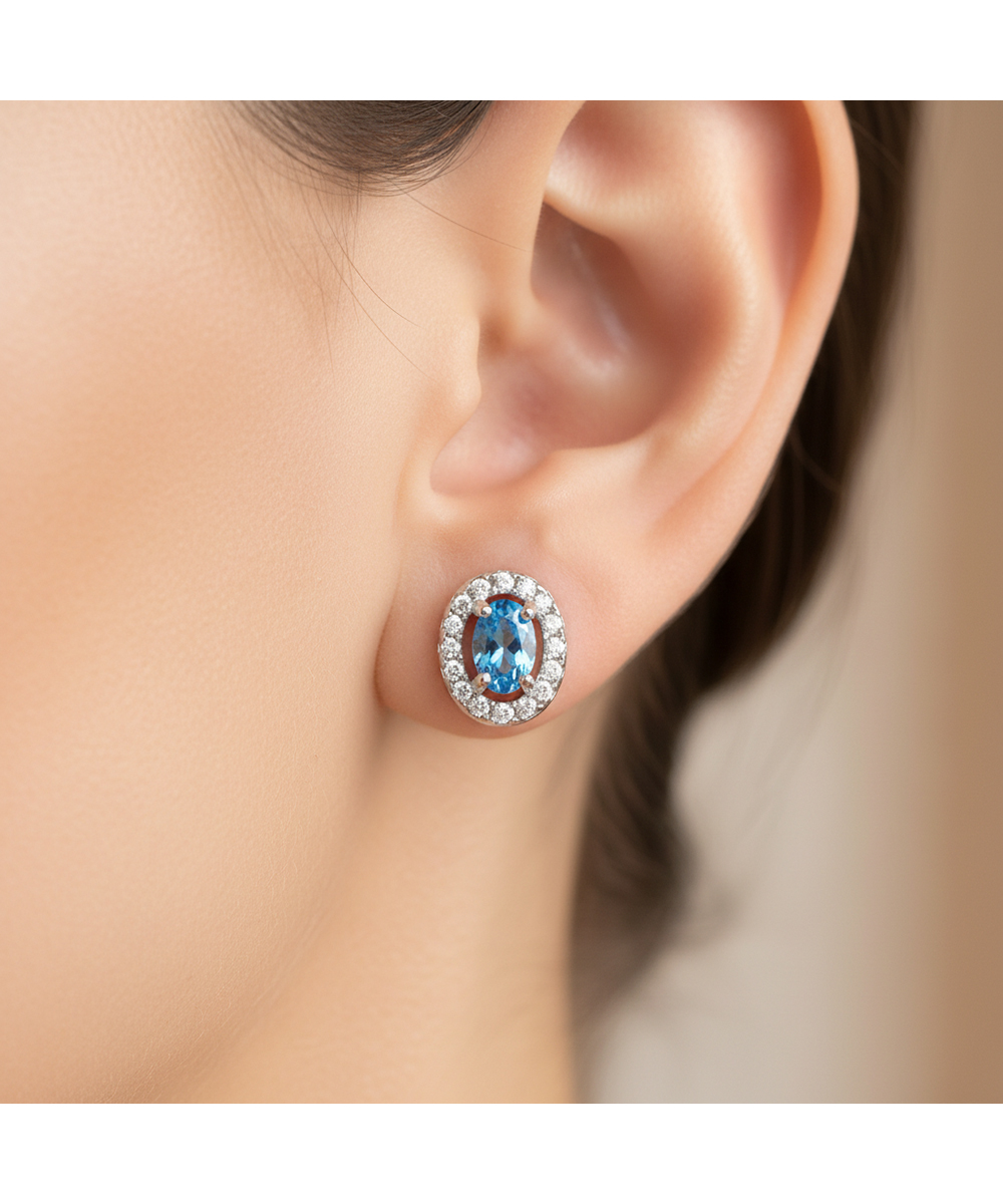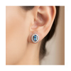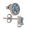 Εντυπωσιακά σκουλαρίκια ροζέτα από λευκόχρυσο 9 καράτια με μπλε Ζιργκόν στο κέντρο και λευκά Ζιργκόν περιμετρικά. Διαχρονική επιλογή για κομψές εμφανίσεις.