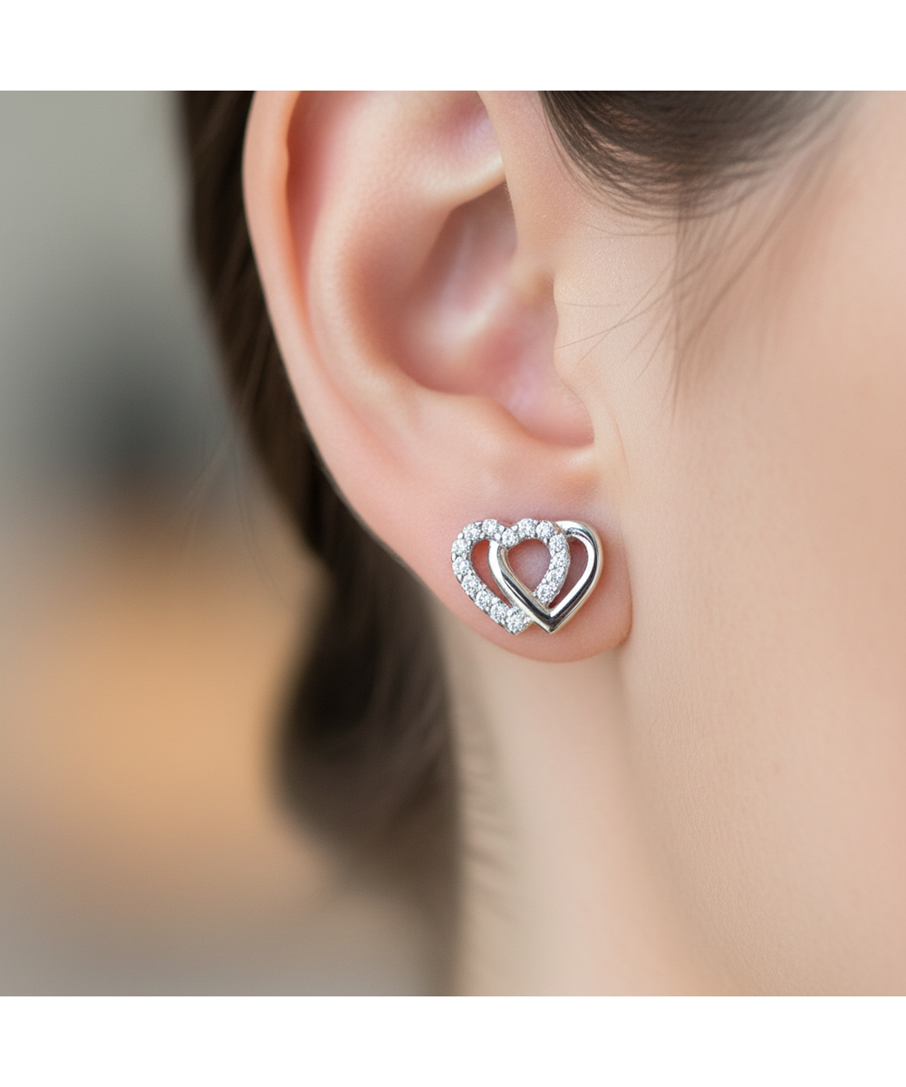 Ρομαντικά σκουλαρίκια καρδιές από λευκόχρυσο 9 καράτια, διακοσμημένα με λαμπερές λευκές πέτρες. Ιδανικά για δώρο αγάπης ή για καθημερινή κομψότητα.