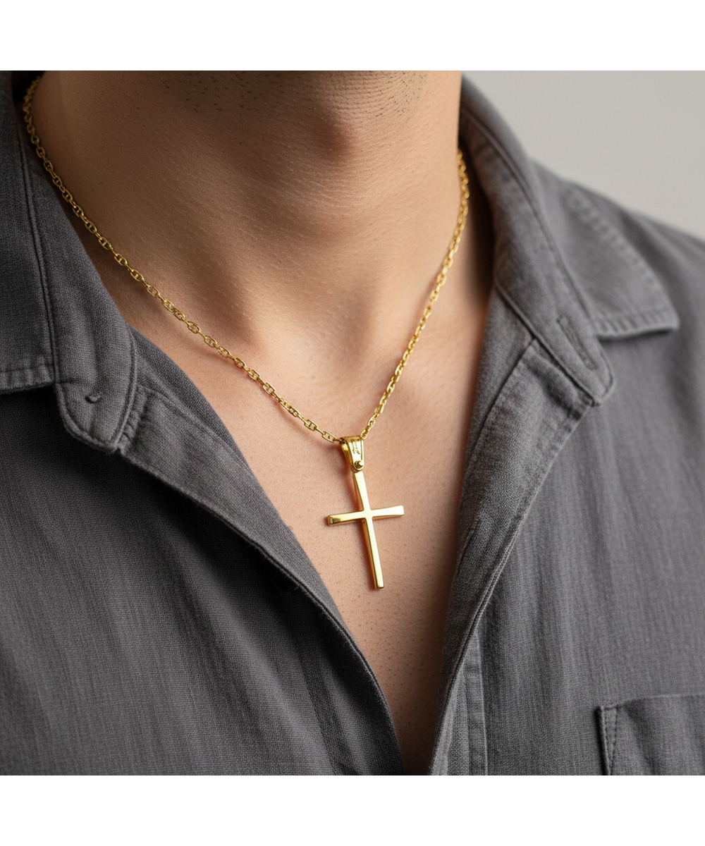 Minimal σταυρός από χρυσό 14 καράτια με καθαρές γραμμές και διακριτικό φινίρισμα. Ελαφρύς και άνετος για καθημερινή χρήση, αποτελεί ιδανική επιλογή για όσους αγαπούν τη λιτή κομψότητα και τα διαχρονικά σύμβολα πίστης.