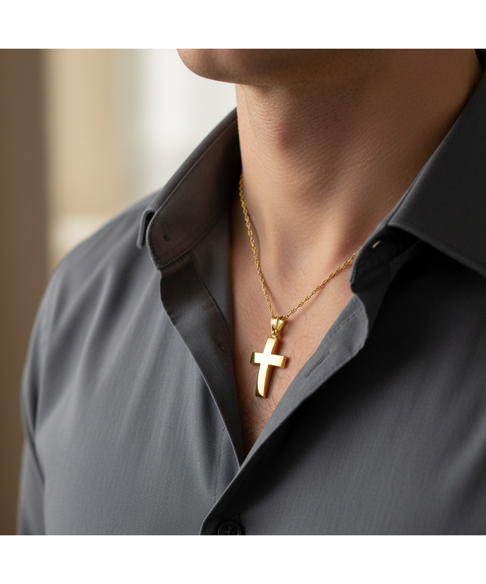 Εντυπωσιακός σταυρός από χρυσό 14 καράτια με κομψό όγκο και προσεγμένο φινίρισμα. Συνδυάζει τον παραδοσιακό χαρακτήρα με σύγχρονη αισθητική, ιδανικός για καθημερινή αλλά και πιο επίσημη εμφάνιση.
