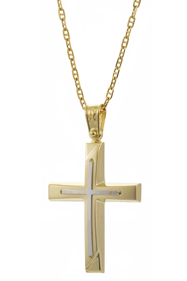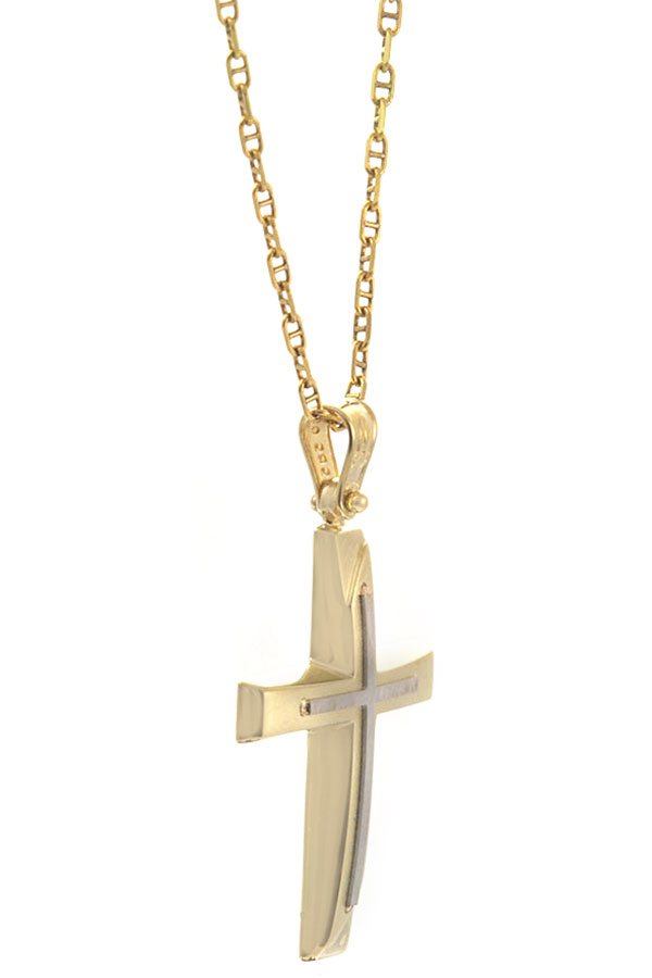 Κομψός σταυρός από χρυσό 14 καράτια με γυαλιστερό φινίρισμα και διακριτική δίχρωμη λεπτομέρεια στο κέντρο. Ο λευκός σταυρός δημιουργεί elegant αντίθεση, προσφέροντας ένα μοντέρνο αλλά διαχρονικό αποτέλεσμα. Ιδανικός για καθημερινή χρήση ή ως συμβολικό δώρο πίστης.