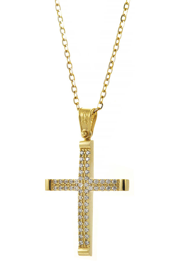 Εντυπωσιακός σταυρός από χρυσό 14 καράτια, με λαμπερά ζιργκόν που προσθέτουν διακριτική πολυτέλεια. Κλασικός σχεδιασμός με προσεγμένες λεπτομέρειες, ιδανικός για καθημερινό styling αλλά και για ιδιαίτερες περιστάσεις. Ένα κόσμημα διαχρονικής αξίας.